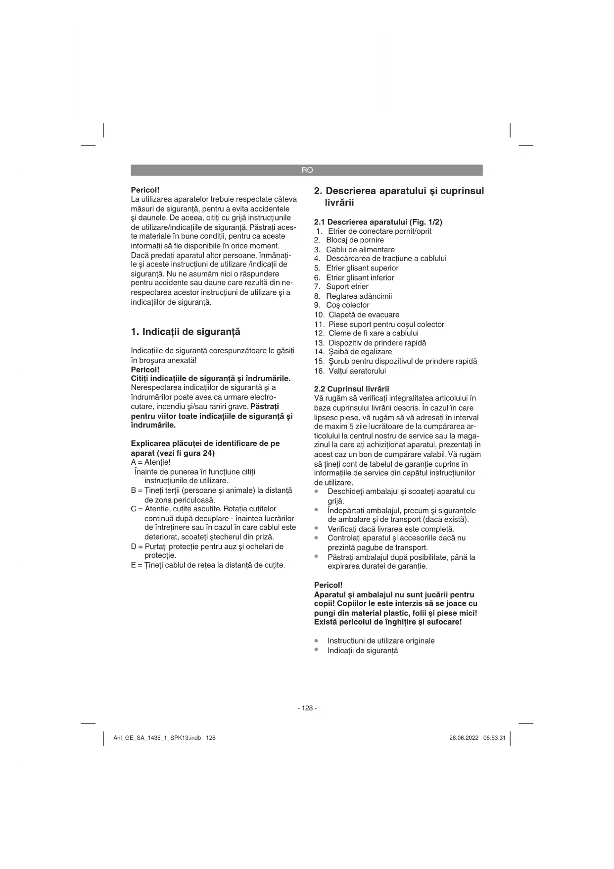 Purtaţi mănuşi! Atenţie! Riscuri reziduale Riscurile reziduale nu pot fi eliminate com- plet, chiar dacă manipulaţi această sculă electrică în mod regulamentar. Următoarele pericole pot apărea, dependente de tipul con- structiv şi execuţia acestei scule electrice: Anl_GE_SA_1435_1_SPK13.indb 129Anl_GE_SA_1435_1_SPK13.indb 129 28.06.2022 08:53:3128.06.2022 08:53:31RO