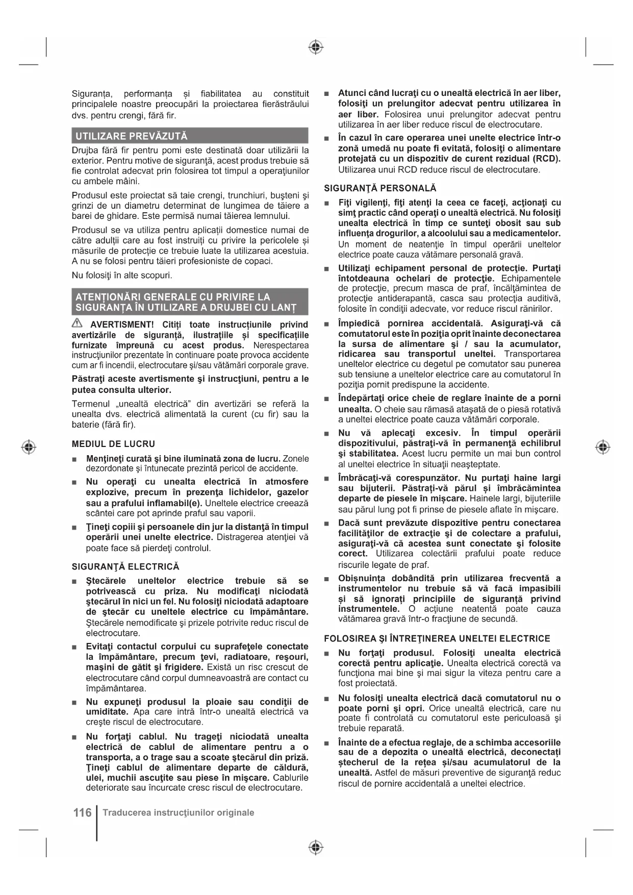 Drujba fără fi r pentru pomi este destinată doar utilizării la exterior. Pentru motive de siguranţă, acest produs trebuie să fi e controlat adecvat prin folosirea tot timpul a operaţiunilor cu ambele mâini. Produsul este proiectat să taie crengi, trunchiuri, buşteni şi grinzi de un diametru determinat de lungimea de tăiere a barei de ghidare. Este permisă numai tăierea lemnului. Produsul se va utiliza pentru aplicații domestice numai de către adulții care au fost instruiți cu privire la pericolele și măsurile de protecție ce trebuie luate la utilizarea acestuia. A nu se folosi pentru tăieri profesioniste de copaci. Nu folosiţi în alte scopuri. ATENȚIONĂRI GENERALE CU PRIVIRE LA SIGURANȚA ÎN UTILIZARE A DRUJBEI CU LANȚ AVERTISMENT! Citiți toate instrucțiunile privind avertizările de siguranță, ilustrațiile și specificațiile furnizate împreună cu acest produs. Nerespectarea instrucţiunilor prezentate în continuare poate provoca accidente cum ar fi incendii, electrocutare şi/sau vătămări corporale grave. Păstraţi aceste avertismente şi instrucţiuni, pentru a le putea consulta ulterior. Termenul „unealtă electrică” din avertizări se referă la unealta dvs. electrică alimentată la curent (cu fi r) sau la baterie (fără fi r).