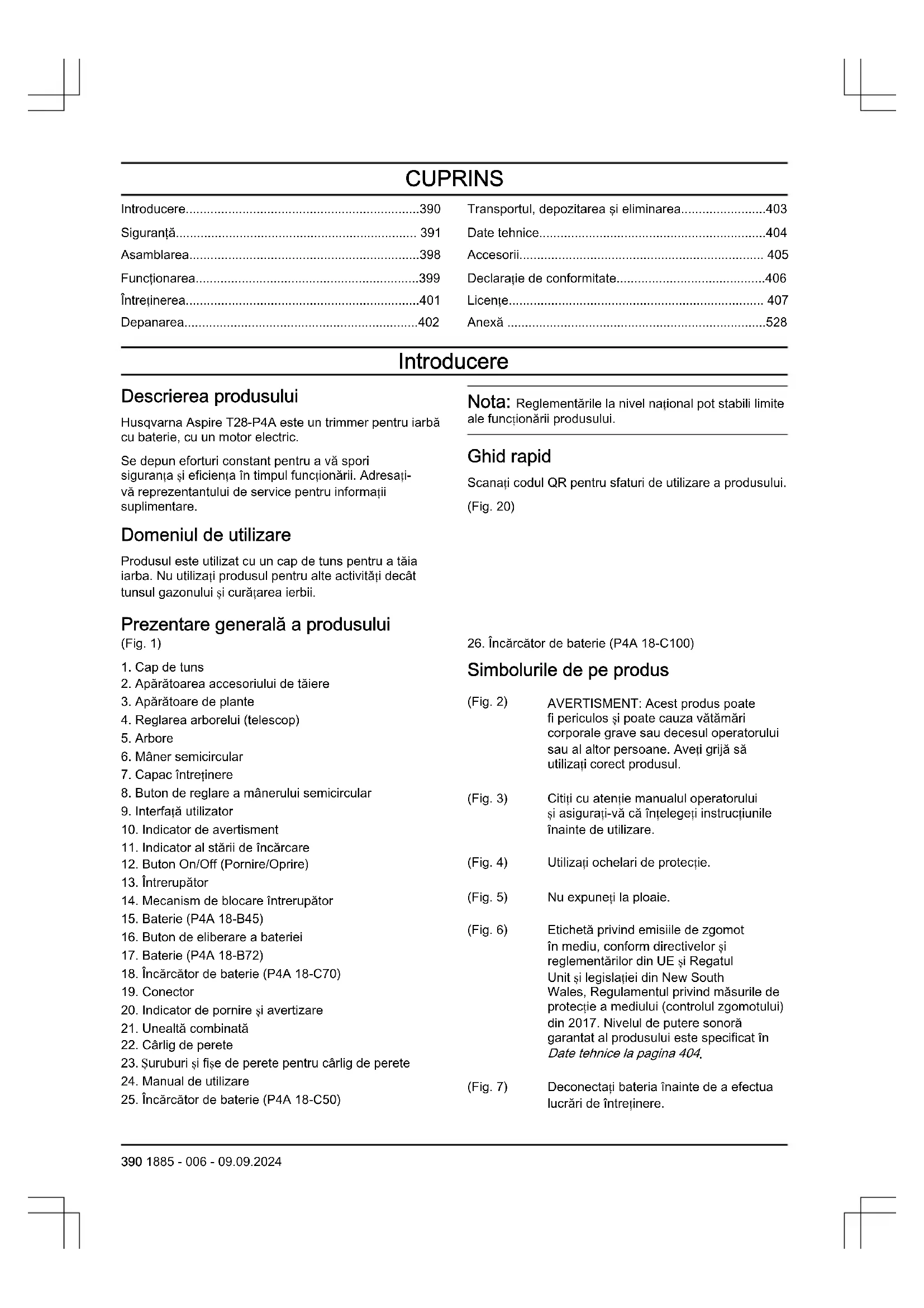 - Anexă Introducere Descrierea produsului Husqvarna Aspire T28-P4A este un trimmer pentru iarbă cu baterie, cu un motor electric. Se depun eforturi constant pentru a vă spori siguranța și eficiența în timpul funcționării. Adresați- vă reprezentantului de service pentru informații suplimentare. Domeniul de utilizare Produsul este utilizat cu un cap de tuns pentru a tăia iarba. Nu utilizați produsul pentru alte activități decât tunsul gazonului și curățarea ierbii. Nota: Reglementările la nivel național pot stabili limite ale funcționării produsului. Ghid rapid Scanați codul QR pentru sfaturi de utilizare a produsului. (Fig. 20) Prezentare generală a produsului (Fig. 1) p. 528