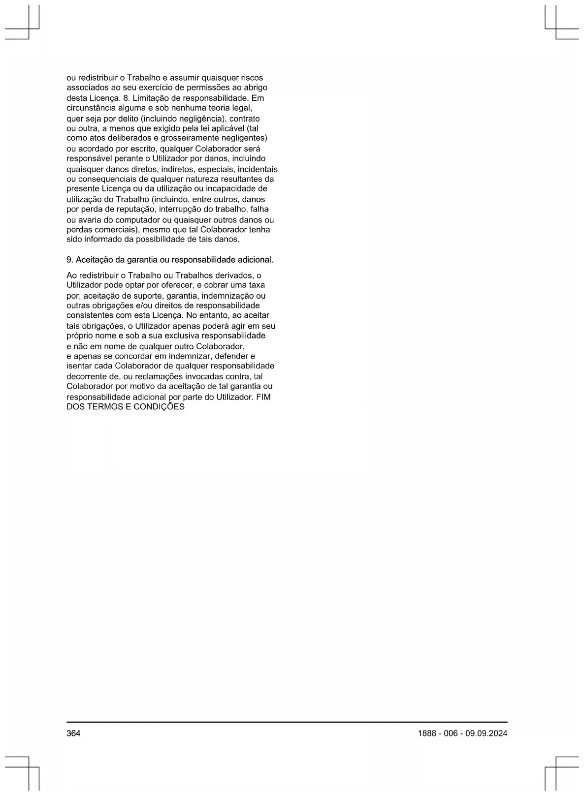 1888 - 006 - 09.09.2024daune directe, indirecte, speciale, accidentale, sau pe cale de consecință, de orice natură, care rezultă din această licență sau din utilizarea sau incapacitatea de a utiliza lucrarea (inclusiv, dar fără a se limita la daune pentru pierderea fondului comercial, oprirea activității, defecțiuni sau defecțiuni ale calculatorului sau orice alte daune sau pierderi comerciale), chiar dacă respectivul contribuitor a fost informat de posibilitatea unor astfel de daune.