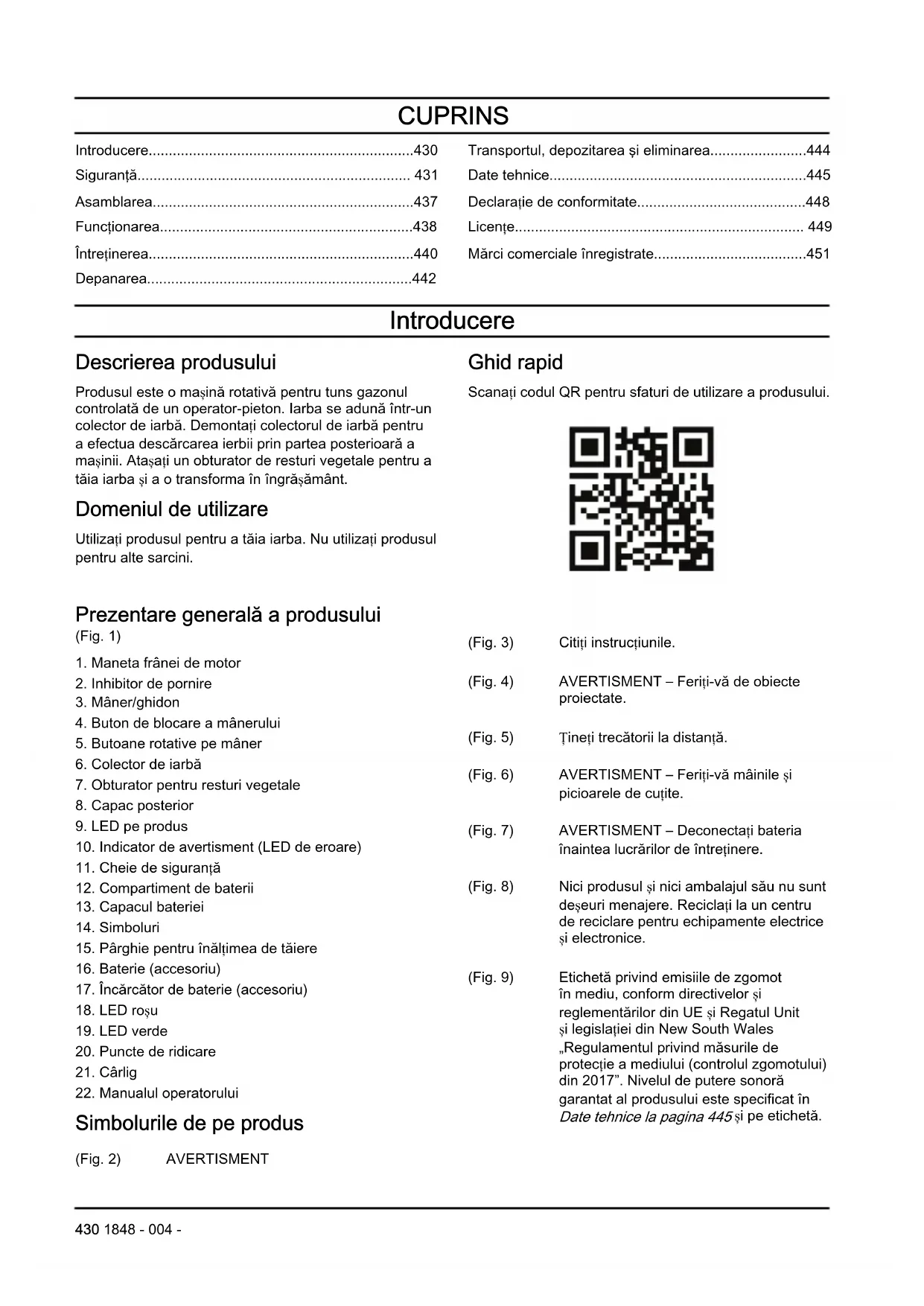 Simbolurile de pe produs (Fig. 2) AVERTISMENT (Fig. 3) Citiți instrucțiunile. (Fig. 4) AVERTISMENT – Feriți-vă de obiecte proiectate. (Fig. 5) Țineți trecătorii la distanță. (Fig. 6) AVERTISMENT – Feriți-vă mâinile și picioarele de cuțite. (Fig. 7) AVERTISMENT – Deconectați bateria înaintea lucrărilor de întreținere. (Fig. 8) Nici produsul și nici ambalajul său nu sunt deșeuri menajere. Reciclați la un centru de reciclare pentru echipamente electrice și electronice. (Fig. 9) Etichetă privind emisiile de zgomot în mediu, conform directivelor și reglementărilor din UE și Regatul Unit și legislației din New South Wales „Regulamentul privind măsurile de protecție a mediului (controlul zgomotului) din 2017”. Nivelul de putere sonoră garantat al produsului este specificat în Date tehnice la pagina 445 și pe etichetă. 430 1848 - 004 -(Fig. 10) Acest accesoriu este conform cu directivele UE aplicabile. (Fig. 11) Acest produs este în conformitate cu reglementările aplicabile din Regatul Unit. (Fig. 12) Produsul este protejat de scurgere. (Fig. 13) Eliberați maneta frânei de motor pentru oprire. (Fig. 14) Împingeți maneta frânei de motor pentru a porni antrenarea cuțitelor. (Fig. 15) Cod scanabil. (Fig. 18) Rotiți pentru a bloca sau debloca. Nota: Celelalte simboluri/autocolante de pe produs se referă la cerințele de certificare pentru unele piețe. Simbolurile de pe baterie și/sau de pe încărcător (Fig. 19) Reciclați acest pro- dus la un centru de reciclare pentru echi- pamente electrice și electronice. (Este va- labilă numai pentru Europa) (Fig. 20) Utilizați bateria numai în produse de la par- tenerii Sistemului PO- WER FOR ALL. (Fig. 21) Protejați bateria împotriva căldurii, de exemplu împotriva expunerii continue la lumină solară intensă, a focului, murdă- riei, apei și umezelii. Există risc de ex- plozie și de scurtcircuit. (Fig. 22) (Fig. 16) Utilizați și păstrați încărcătorul de baterii numai în interior. (Fig. 17) Izolație dublă. Etichetele de pe produs (Fig. 23) PERICOL – Țineți picioarele și mâinile la distanță. Răspunderea pentru produs Conform prevederilor legislației privind răspunderea pentru produs, nu ne asumăm răspunderea pentru daunele cauzate de produsul nostru dacă: