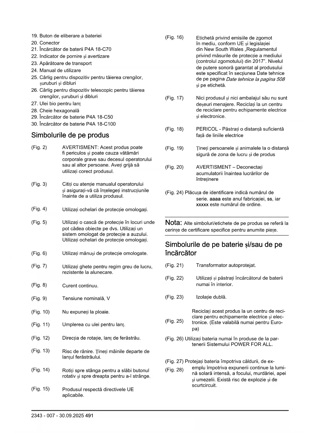 Simbolurile de pe produs (Fig. 2) AVERTISMENT: Acest produs poate fi periculos și poate cauza vătămări corporale grave sau decesul operatorului sau al altor persoane. Aveți grijă să utilizați corect produsul. (Fig. 3) Citiți cu atenție manualul operatorului și asigurați-vă că înțelegeți instrucțiunile înainte de a utiliza produsul. (Fig. 4) Utilizați ochelari de protecție omologați. (Fig. 5) Utilizați o cască de protecție în locuri unde pot cădea obiecte pe dvs. Utilizați un sistem omologat de protecție a auzului. Utilizați ochelari de protecție omologați. (Fig. 6) Utilizați mănuși de protecție omologate. (Fig. 7) Utilizați ghete pentru regim greu de lucru, rezistente la alunecare. (Fig. 8) Curent continuu. (Fig. 9) Tensiune nominală, V (Fig. 10) Nu expuneți la ploaie. (Fig. 11) Umplerea cu ulei pentru lanț. (Fig. 12) Direcția de rotație, lanț de ferăstrău. (Fig. 13) Risc de rănire. Țineți mâinile departe de lanțul ferăstrăului. (Fig. 14) Rotiți spre stânga pentru a slăbi butonul rotativ și spre dreapta pentru a-l strânge. (Fig. 15) Produsul respectă directivele UE aplicabile. (Fig. 16) Etichetă privind emisiile de zgomot în mediu, conform UE și legislației din New South Wales „Regulamentul privind măsurile de protecție a mediului (controlul zgomotului) din 2017”. Nivelul de putere sonoră garantat al produsului este specificat în secțiunea Date tehnice de pe pagina Date tehnice la pagina 508 și pe etichetă. (Fig. 17) Nici produsul și nici ambalajul său nu sunt deșeuri menajere. Reciclați la un centru de reciclare pentru echipamente electrice și electronice. (Fig. 18) PERICOL - Păstrați o distanță suficientă față de liniile electrice (Fig. 19) Țineți persoanele și animalele la o distanță sigură de zona de lucru și de produs (Fig. 20) AVERTISMENT – Deconectați acumulatorii înaintea lucrărilor de întreținere (Fig. 24) Plăcuța de identificare indică numărul de serie. aaaa este anul fabricației, ss, iar xxxxx este numărul de ordine. Nota: Alte simboluri/etichete de pe produs se referă la cerințe de certificare specifice pentru anumite piețe. Simbolurile de pe baterie și/sau de pe încărcător (Fig. 21) Transformator autoprotejat. (Fig. 22) Utilizați și păstrați încărcătorul de baterii numai în interior. (Fig. 23) Izolație dublă. (Fig. 25) Reciclați acest produs la un centru de reci- clare pentru echipamente electrice și elec- tronice. (Este valabilă numai pentru Euro- pa) (Fig. 26) Utilizați bateria numai în produse de la par- tenerii Sistemului POWER FOR ALL. (Fig. 27) Protejați bateria împotriva căldurii, de ex- emplu împotriva expunerii continue la lumi- nă solară intensă, a focului, murdăriei, apei și umezelii. Există risc de explozie și de scurtcircuit. (Fig. 28) 2343 - 007 - 30.09.2025 491Deteriorarea produsului Nu suntem responsabili pentru deteriorarea produsului dacă: