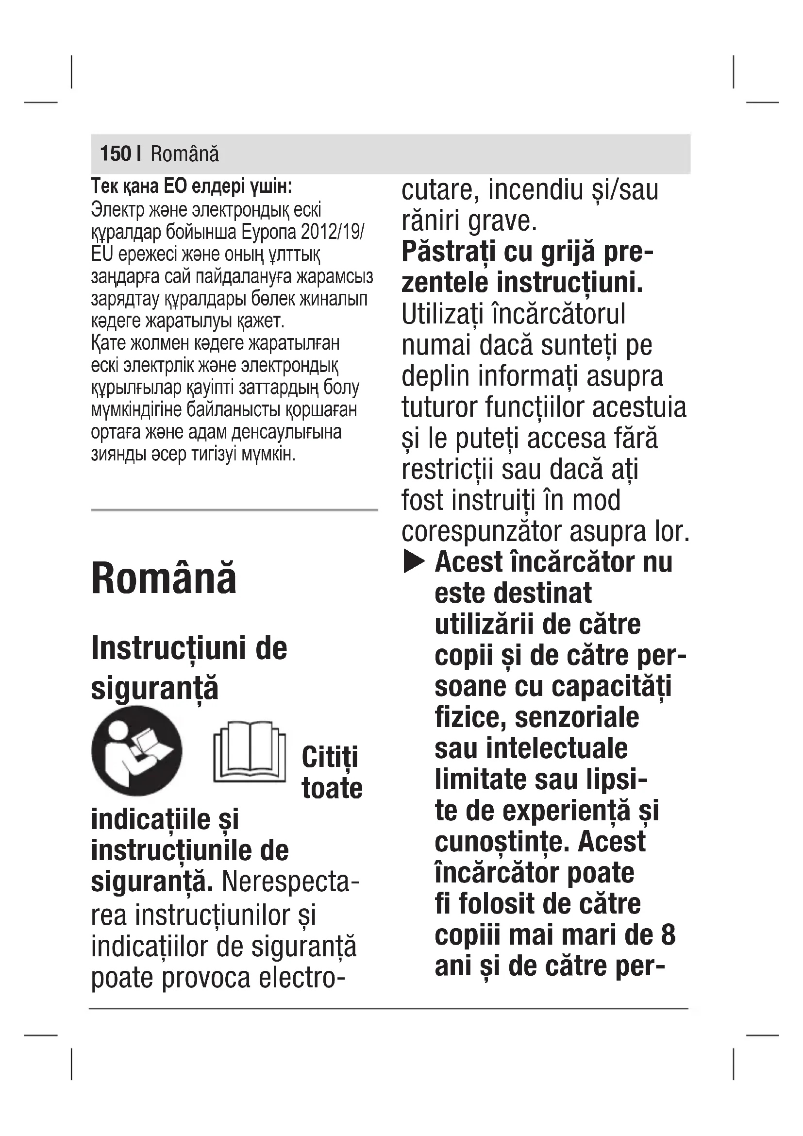 Шешімі: аккумулятор температурасы рұқсат етілген зарядтау температураларының диапазонына (0–45°C) қайтып оралғанша күтіңіз. Индикаторлар жанбай тұр Индикатор жанбайды, аккумулятор зардталмайды. Себебі: розетка, қуат кабелі немесе зарядтау құрылғысы ақаулы Шешімі: желі кернеуін тексеріңіз. Қажет болса, зарядтау құралын уәкілетті қызмет көрсету орталығында тексеріңіз. Себебі: зарядтау құрылғысының қуат ашасы (дұрыс) қосылмаған Шешімі: қуат ашасын розеткаға (толығымен) салыңыз. Кәдеге жарату Зарядтау құралын, оның жабдықтары мен қаптамасын қоршаған ортаны қорғайтын кәдеге жарату орнына тапсыру қажет. Зарядтау құралын үй қоқысына тастамаңыз! Қазақ150 | Тек қана ЕО елдері үшін: Электр және электрондық ескі құралдар бойынша Еуропа 2012/19/ EU ережесі және оның ұлттық заңдарға сай пайдалануға жарамсыз зарядтау құралдары бөлек жиналып кәдеге жаратылуы қажет. Қате жолмен кәдеге жаратылған ескі электрлік және электрондық құрылғылар қауіпті заттардың болу мүмкіндігіне байланысты қоршаған ортаға және адам денсаулығына зиянды әсер тигізуі мүмкін. Română Instrucţiuni de siguranţă Citiţi toate indicaţiile şi instrucţiunile de siguranţă. Nerespecta- rea instrucţiunilor şi indicaţiilor de siguranţă poate provoca electro- cutare, incendiu şi/sau răniri grave. Păstraţi cu grijă pre- zentele instrucţiuni. Utilizaţi încărcătorul numai dacă sunteţi pe deplin informaţi asupra tuturor funcţiilor acestuia şi le puteţi accesa fără restricţii sau dacă aţi fost instruiţi în mod corespunzător asupra lor. u Acest încărcător nu este destinat utilizării de către copii şi de către per- soane cu capacităţi fizice, senzoriale sau intelectuale limitate sau lipsi- te de experienţă şi cunoştinţe. Acest încărcător poate fi folosit de către copiii mai mari de 8 ani şi de către per- Română| 151 soane cu capacităţi fizice, senzoriale sau intelectuale limitate sau lipsi- te de experienţă şi cunoştinţe, numai dacă acestea sunt supravegheate sau sunt instrui- te privitor la fo- losirea sigură a încărcătorului şi înţeleg pericolele pe care aceasta le implică. În caz con- trar există pericol de manevrare greşită şi răniri. u Supravegheaţi copiii în timpul folo- sirii, curăţării şi întreţinerii. Astfel veţi avea siguranţa că, copiii nu se joacă cu încărcătorul. u Încărcați numai baterii de 18 V cu o capacitate de 1,5 Ah pentru sistemul POWER FOR ALL. Tensiunea acumula- torului trebuie să se potrivească cu ten- siunea de încărcare a încărcătorului. Nu încărca acumulatori de unică folosinţă. În caz contrar, există pericolul de incendiu şi explozie. Utilizează încărcătorul numai în încăperi închise şi protejează-l împotriva umezelii. Pătrunderea apei într-un încărcător creşte riscul de electrocutare. u Menţineţi curat încărcătorul. Din cauza murdăriei Română152 | există pericol de elec- trocutare. u Înainte de fiecare utilizare, verifică încărcătorul, in- clusiv cablul şi fişa. Nu folosiţi încărcătorul în cazul în care constataţi deteriorări ale acestuia. Nu deschideți dvs. înşivă încărcătorul, ci duceți-l la reparat numai la Husqvarna sau la un centru de service post-vân- zare autorizat care foloseşte numai pie- se de schimb origi- nale. Încărcătoarele, cablurile şi ştecherele defecte măresc riscul de electrocutare. u Nu folosiţi încărcătorul pe o suprafaţă uşor inflamabilă (de ex. hârtie, materiale textile etc.) respec- tiv într-un mediu inflamabil. Deoa- rece încărcătorul se încălzeşte în timpul procesului de încărcare, există pericol de incendiu. u Nu obturaţi fantele de ventilaţie ale încărcătorului. În caz contrar, încărcătorul se poate supraîncălzi şi este posibil să nu mai funcţioneze în mod corespunzător. u Încărcaţi acumulatorii numai în încărcătoarele recomandate de producător. Dacă un încărcător destinat Română| 153 unui anumit tip de acumulator este folo- sit la încărcarea altor tipuri de acumulator decât cele prevăzute pentru el, există peri- col de incendiu. u În cazul deteriorării sau utilizării necorespunzătoare a acumulatorului se pot degaja vapori. Aerisiţi cu aer proaspăt iar dacă vi se face rău consultaţi un medic. Vaporii pot irita căile respiratorii. u În cazul utilizării greşite, se poate scurge lichid din acumulator; evitaţi contactul cu acesta. În cazul contactu- lui accidental cu acesta, clătiţi cu apă zona afectată. În cazul contactului lichidului cu ochii, consultaţi de ase- menea un medic. Lichidul scurs din acumulator poate pro- duce iritaţii ale pielii sau arsuri. Descrierea produsului şi a performanţelor acestuia Utilizarea conform destinaţiei Încărcătorul este numai pentru baterii reîncărcabile de 18 V din sistemul POWER FOR ALL. Română154 | Componentele ilustrate (1) Indicator roşu privind monitorizarea temperaturii/ starea de eroare (2) Indicatorul verde al nivelului de încărcare (3) Compartiment de încărcare Date tehnice Încărcător P4A 18-C70 Clasa de protecţie / II Curent 