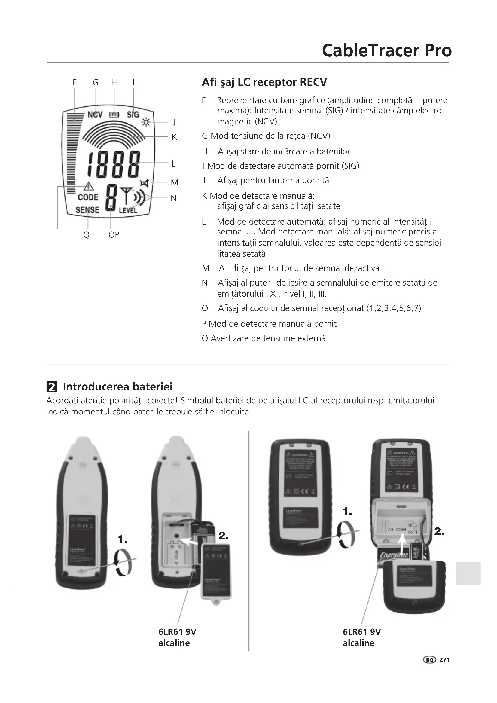 ea. – Prin codarea semnalului este posibilń utilizarea a max. 7 emiŰńtoare ŭi a unui receptor, pentru lucrul în instalaŰiile complexe – Detectorul tensiune AC integrat recunoaŭte ŭi localizeazń cablurile conductoare de energie. – Avertizarea permanentń de tensiune AC la emiŰńtor ŭi receptor sporeŭte siguranŰa. – Mod automat ŭi manual, pentru ajustarea corectń la obiectul de mńsurat – Iluminare integratń a punctului mńsurat, prin intermediul iluminńrii cu LED – Categoria de supratensiune CAT III (conform EN 61010-1, max. 300V) ŭi toate categoriile inferioare. Aparatele ŭi accesoriile nu trebuie sń Ö e utilizate în categoria de supratensiune CAT IV (de ex. la surse de instalaŰii de joasń tensiune). – UtilizaŰi aparatul exclusiv conform destinaŰiei sale de utilizare cu respectarea speciÖ caŰiilor. – UtilizaŰi exclusiv cablurile de mńsurń originale. Acestea trebuie sń prezinte aceleaŭi caracteristici de tensiune, categorie ŭi amperaj ca aparatul de mńsurń. – Aparatul trebuie s ń Ö e deconectat de la toate sursele de energie înaintea deschiderii capacului compartimentului pentru baterii. – Dacń este posibil, nu efectua Űi singuri lucrńrile. – ĶineŰi aparatul numai de mânerul destinat în acest scop. Vârfurile de mńsurń nu trebuie sń Ö e atinse în timpul mńsurńtorii. – La manipularea unor tensiuni mai mari de 25V AC resp. 60V DC este necesarń o atenŰie deosebitń. La atingerea conductorilor electrici existń, la aceste tensiuni, pericol producerii unui ŭoc electric cu potenŰial letal iminent. Funcķionarea / scopul utilizàrii Indicaķii de siguranķà Principiul de funcķionare Mńsurarea are loc cu unul sau mai multe emiŰńtoare ŭi un receptor. EmiŰńtorul alimenteazń semnale co- date în cablu, acestea urmând sń Ö e veriÖ cate. Semnalul constń într-un curent modulat care genereazń un câmp electromagnetic în jurul cablului. Receptorul recunoaŭte acest câmp, îl decodeazń ŭi poate astfel sń recunoascń ŭi sń localizeze cablurile cu semnalul alimentat.