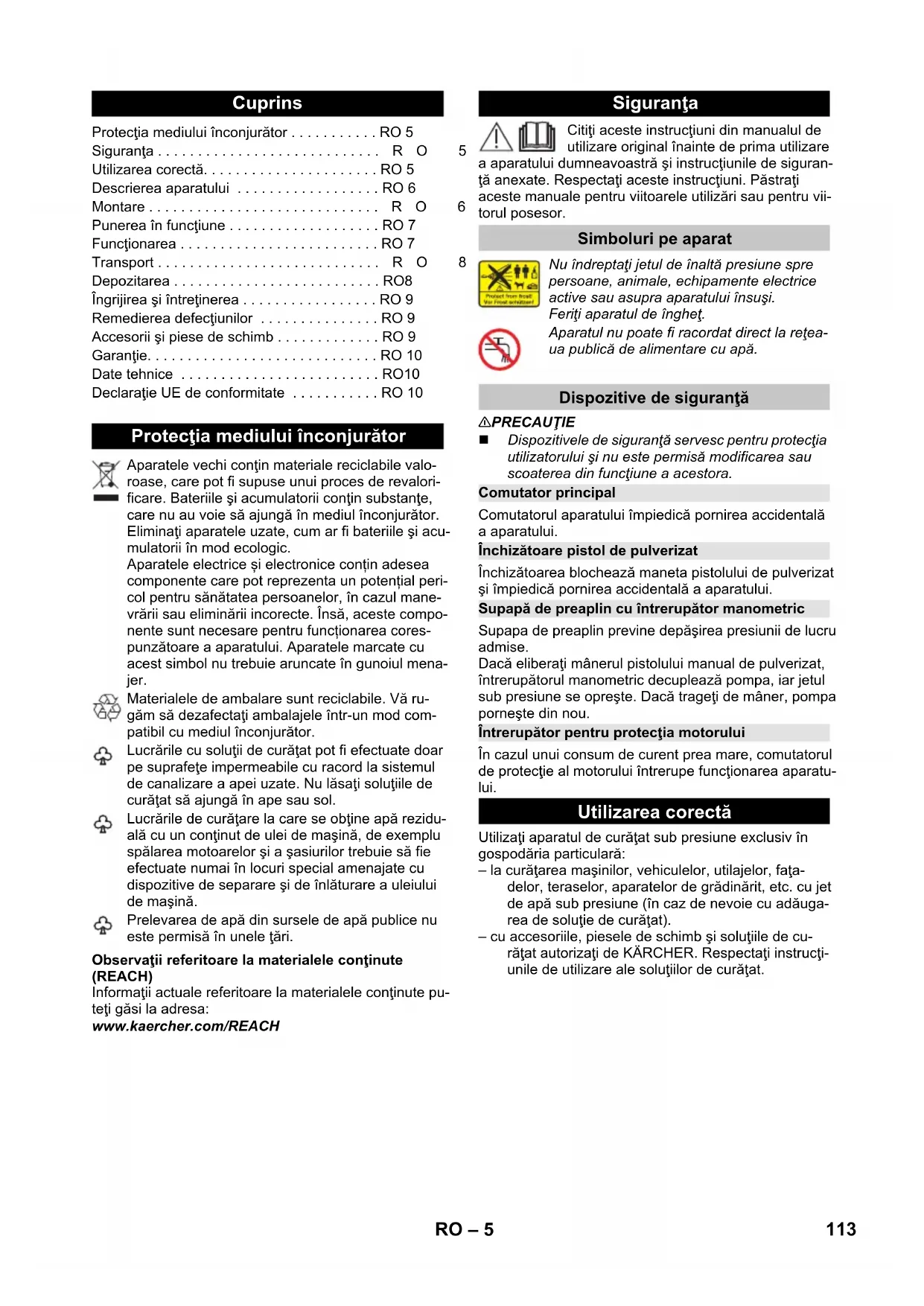 90 dB(A) Zastrzega się prawo wprowadzania zmian technicznych. Deklaracja zgodności UE Produkt: Myjka wysokociśnieniowa Typ: 1.324-xxx Obowiązujące dyrektywy UE 2006/42/WE (+2009/127/WE) 2014/30/UE 2011/65/UE 2000/14/WE Zastosowane normy zharmonizowane EN 50581 EN 55014–1: 2006+A1: 2009+A2: 2011 EN 55014–2: 2015 EN 60335–1 EN 60335–2–79 EN 61000–3–2: 2014 EN 61000–3–3: 2013 EN 62233: 2008 Zastosowana metoda oceny zgodności 2000/14/WE: Załącznik V Poziom mocy akustycznej dB(A) Zmierzony: 88 Gwarantowany: 90 Winnenden, 2018/10/01 Chairman of the Board of Management Director Regulatory Affairs & Certification 112 PL– 5 Observaţii referitoare la materialele conţinute (REACH) Informaţii actuale referitoare la materialele conţinute pu- teţi găsi la adresa: www.kaercher.com/REACH Citiţi aceste instrucţiuni din manualul de utilizare original înainte de prima utilizare a aparatului dumneavoastră şi instrucţiunile de siguran- ţă anexate. Respectaţi aceste instrucţiuni. Păstraţi aceste manuale pentru viitoarele utilizări sau pentru vii- torul posesor. 몇 PRECAUŢIE Dispozitivele de siguranţă servesc pentru protecţia utilizatorului şi nu este permisă modificarea sau scoaterea din funcţiune a acestora. Comutatorul aparatului împiedică pornirea accidentală a aparatului. Închizătoarea blochează maneta pistolului de pulverizat şi împiedică pornirea accidentală a aparatului. Supapa de preaplin previne depăşirea presiunii de lucru admise. Dacă eliberaţi mânerul pistolului manual de pulverizat, întrerupătorul manometric decuplează pompa, iar jetul sub presiune se opreşte. Dacă trageţi de mâner, pompa porneşte din nou. În cazul unui consum de curent prea mare, comutatorul de protecţie al motorului întrerupe funcţionarea aparatu- lui. Utilizaţi aparatul de curăţat sub presiune exclusiv în gospodăria particulară: – la curăţarea maşinilor, vehiculelor, utilajelor, faţa- delor, teraselor, aparatelor de grădinărit, etc. cu jet de apă sub presiune (în caz de nevoie cu adăuga- rea de soluţie de curăţat). – cu accesoriile, piesele de schimb şi soluţiile de cu- răţat autorizaţi de KÄRCHER. Respectaţi instrucţi- unile de utilizare ale soluţiilor de curăţat. Cuprins Protecţia mediului înconjurător . . . . . . . . . . . RO 5 Siguranţa . . . . . . . . . . . . . . . . . . . . . . . . . . . .RO 5 Utilizarea corectă. . . . . . . . . . . . . . . . . . . . . . RO 5 Descrierea aparatului . . . . . . . . . . . . . . . . . . RO 6 Montare . . . . . . . . . . . . . . . . . . . . . . . . . . . . .RO 6 Punerea în funcţiune . . . . . . . . . . . . . . . . . . . RO 7 Funcţionarea . . . . . . . . . . . . . . . . . . . . . . . . . RO 7 Transport . . . . . . . . . . . . . . . . . . . . . . . . . . . .RO 8 Depozitarea . . . . . . . . . . . . . . . . . . . . . . . . . . RO8 Îngrijirea şi întreţinerea . . . . . . . . . . . . . . . . . RO 9 Remedierea defecţiunilor . . . . . . . . . . . . . . . RO 9 Accesorii şi piese de schimb . . . . . . . . . . . . . RO 9 Garanţie. . . . . . . . . . . . . . . . . . . . . . . . . . . . . RO 10 Date tehnice . . . . . . . . . . . . . . . . . . . . . . . . . RO10 Declaraţie UE de conformitate . . . . . . . . . . . RO 10 Protecţia mediului înconjurător Aparatele vechi conţin materiale reciclabile valo- roase, care pot fi supuse unui proces de revalori- ficare. Bateriile şi acumulatorii conţin substanţe, care nu au voie să ajungă în mediul înconjurător. Eliminaţi aparatele uzate, cum ar fi bateriile şi acu- mulatorii în mod ecologic. Aparatele electrice și electronice conțin adesea componente care pot reprezenta un potențial peri- col pentru sănătatea persoanelor, în cazul mane- vrării sau eliminării incorecte. Însă, aceste compo- nente sunt necesare pentru funcționarea cores- punzătoare a aparatului. Aparatele marcate cu acest simbol nu trebuie aruncate în gunoiul mena- jer. Materialele de ambalare sunt reciclabile. Vă ru- găm să dezafectaţi ambalajele într-un mod com- patibil cu mediul înconjurător. Lucrările cu soluţii de curăţat pot fi efectuate doar pe suprafeţe impermeabile cu racord la sistemul de canalizare a apei uzate. Nu lăsaţi soluţiile de curăţat să ajungă în ape sau sol. Lucrările de curăţare la care se obţine apă rezidu- ală cu un conţinut de ulei de maşină, de exemplu spălarea motoarelor şi a şasiurilor trebuie să fie efectuate numai în locuri special amenajate cu dispozitive de separare şi de înlăturare a uleiului de maşină. Prelevarea de apă din sursele de apă publice nu este permisă în unele ţări. Siguranţa Simboluri pe aparat Nu îndreptaţi jetul de înaltă presiune spre persoane, animale, echipamente electrice active sau asupra aparatului însuşi. Feriţi aparatul de îngheţ. Aparatul nu poate fi racordat direct la reţea- ua publică de alimentare cu apă. Dispozitive de siguranţă Comutator principal Închizătoare pistol de pulverizat Supapă de preaplin cu întrerupător manometric Întrerupător pentru protecţia motorului Utilizarea corectă 113RO– 6 Setul de livrare a aparatului (în funcţie de model) este ilustrat pe ambalaj. Acest manual de utilizare descrie toate opţiunile posibile. Informaţi imediat distribuitorul dumneavoastră dacă lip- sesc părţi componente sau dacă intervin defecţiuni la transport. Pentru imagini vezi pagina interioară 3 1 Piesă de cuplare pentru conexiunea de apă 2 Racord de apă cu sită inclusă 3 Furtun de înaltă presiune 4 Suport pentru furtun 5 Spaţiu de depozitare pentru lănci 6 Suport / poziţie de parcare pentru pistolul de pulve- rizat 7 Racord Plug 'n' Clean pentru soluţie de curăţat 8 Mâner pentru transport 9 Mâner pentru transport, extensibilă 10 Suport pentru furtun 11 Racord de presiune înaltă 12 Comutatorul aparatului „0/OFF“ / „I/ON“ 13 Cablu de reţea cu ştecher 14 Plăcuţa de tip 15 Compartimentul pen