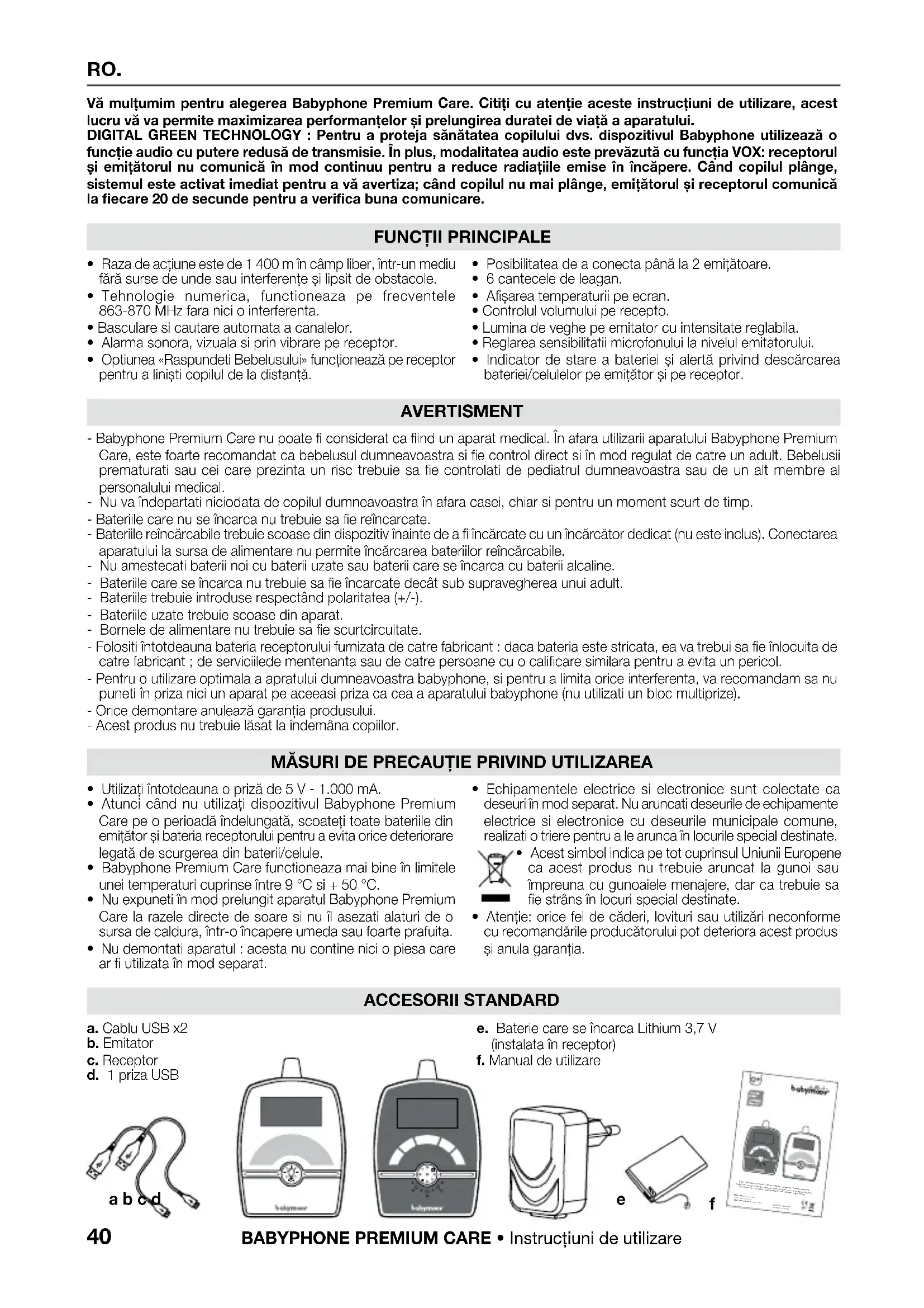 RO. Vă mulțumim pentru alegerea Babyphone Premium Care. Citiți cu atenție aceste instrucțiuni de utilizare, acest lucru vă va permite maximizarea performanțelor și prelungirea duratei de viață a aparatului. DIGITAL GREEN TECHNOLOGY : Pentru a proteja sănătatea copilului dvs. dispozitivul Babyphone utilizează o funcție audio cu putere redusă de transmisie. În plus, modalitatea audio este prevăzută cu funcția VOX: receptorul și emițătorul nu comunică în mod continuu pentru a reduce radiațiile emise în încăpere. Când copilul plânge, sistemul este activat imediat pentru a vă avertiza; când copilul nu mai plânge, emițătorul și receptorul comunică la fiecare 20 de secunde pentru a verifica buna comunicare.41