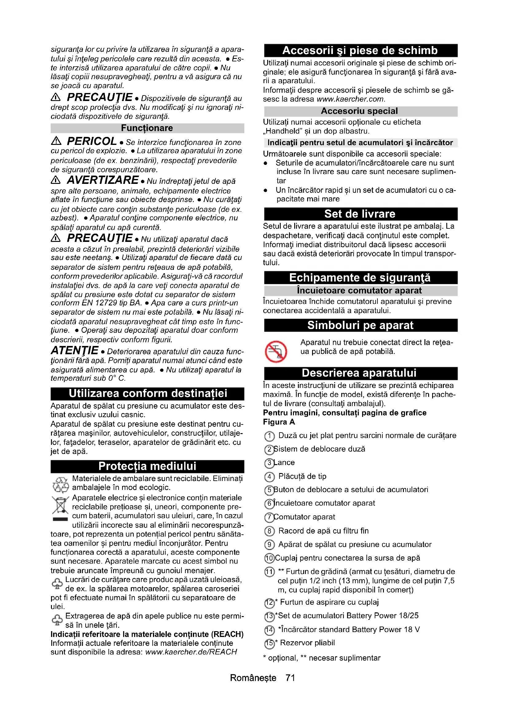 • Declaraţie de conformitate UE Româneşte 71 siguranţa lor cu privire la utilizarea în siguranţă a apara- tului şi înţeleg pericolele care rezultă din aceasta. ● Es- te interzisă utilizarea aparatului de către copii. ● Nu lăsaţi copiii nesupravegheaţi, pentru a vă asigura că nu se joacă cu aparatul. 몇 PRECAUŢIE ● Dispozitivele de siguranţă au drept scop protecţia dvs. Nu modificaţi şi nu ignoraţi ni- ciodată dispozitivele de siguranţă. Funcționare PERICOL ● Se interzice funcţionarea în zone cu pericol de explozie. ● La utilizarea aparatului în zone periculoase (de ex. benzinării), respectaţi prevederile de siguranţă corespunzătoare. 몇 AVERTIZARE ● Nu îndreptaţi jetul de apă spre alte persoane, animale, echipamente electrice aflate în funcţiune sau obiecte desprinse. ● Nu curăţaţi cu jet obiecte care conţin substanţe periculoase (de ex. azbest). ● Aparatul conţine componente electrice, nu spălaţi aparatul cu apă curentă. 몇 PRECAUŢIE ● Nu utilizaţi aparatul dacă acesta a căzut în prealabil, prezintă deteriorări vizibile sau este neetanş. ● Utilizaţi aparatul de fiecare dată cu separator de sistem pentru reţeaua de apă potabilă, conform prevederilor aplicabile. Asiguraţi-vă că racordul instalaţiei dvs. de apă la care veţi conecta aparatul de spălat cu presiune este dotat cu separator de sistem conform EN 12729 tip BA. ● Apa care a curs printr-un separator de sistem nu mai este potabilă. ● Nu lăsaţi ni- ciodată aparatul nesupravegheat cât timp este în func- ţiune. ● Operaţi sau depozitaţi aparatul doar conform descrierii, respectiv conform figurii. ATENŢIE ● Deteriorarea aparatului din cauza func- ţionării fără apă. Porniți aparatul numai atunci când este asigurată alimentarea cu apă. ● Nu utilizaţi aparatul la temperaturi sub 0° C. Utilizarea conform destinației Aparatul de spălat cu presiune cu acumulator este des- tinat exclusiv uzului casnic. Aparatul de spălat cu presiune este destinat pentru cu- răţarea maşinilor, autovehiculelor, construcţiilor, utilaje- lor, faţadelor, teraselor, aparatelor de grădinărit etc. cu jet de apă. Protecția mediului Materialele de ambalare sunt reciclabile. Eliminați ambalajele în mod ecologic. Aparatele electrice și electronice conțin materiale reciclabile prețioase și, uneori, componente pre- cum baterii, acumulatori sau uleiuri, care, în cazul utilizării incorecte sau al eliminării necorespunză- toare, pot reprezenta un potențial pericol pentru sănăta- tea oamenilor și pentru mediul înconjurător. Pentru funcționarea corectă a aparatului, aceste componente sunt necesare. Aparatele marcate cu acest simbol nu trebuie aruncate împreună cu gunoiul menajer. Lucrări de curăţare care produc apă uzată uleioasă, de ex. la spălarea motoarelor, spălarea caroseriei pot fi efectuate numai în spălătorii cu separatoare de ulei. Extragerea de apă din apele publice nu este permi- să în unele ţări. Indicații referitoare la materialele conținute (REACH) Informații actuale referitoare la materialele conținute sunt disponibile la adresa: www.kaercher.de/REACH Accesorii şi piese de schimb Utilizaţi numai accesorii originale şi piese de schimb ori- ginale; ele asigură funcţionarea în siguranţă şi fără ava- rii a aparatului. Informaţii despre accesorii şi piesele de schimb se gă- sesc la adresa www.kaercher.com. Accesoriu special Utilizați numai accesorii opționale cu eticheta „Handheld” și un dop albastru. Indicaţii pentru setul de acumulatori şi încărcător Următoarele sunt disponibile ca accesorii speciale: ● Seturile de acumulatori/încărcătoarele care nu sunt incluse în livrare sau care sunt necesare suplimen- tar ● Un încărcător rapid și un set de acumulatori cu o ca- pacitate mai mare Set de livrare Setul de livrare a aparatului este ilustrat pe ambalaj. La despachetare, verificaţi dacă conţinutul este complet. Informaţi imediat distribuitorul dacă lipsesc accesorii sau dacă există deteriorări provocate în timpul transpor- tului. Echipamente de siguranţă Încuietoare comutator aparat Încuietoarea închide comutatorul aparatului şi previne conectarea accidentală a aparatului. Simboluri pe aparat Descrierea aparatului În aceste instrucţiuni de utilizare se prezintă echiparea maximă. În funcţie de model, există diferenţe în pache- tul de livrare (consultaţi ambalajul). Pentru imagini, consultați pagina de grafice Figura A 1 Duză cu jet plat pentru sarcini normale de curățare 2 Sistem de deblocare duză 3 Lance 4 Plăcuță de tip 5 Buton de deblocare a setului de acumulatori 6 Încuietoare comutator aparat 7 Comutator aparat 8 Racord de apă cu filtru fin 9 Apărat de spălat cu presiune cu acumulator 10 Cuplaj pentru conectarea la sursa de apă 11 ** Furtun de grădină (armat cu țesături, diametru de cel puțin 1/2 inch (13 mm), lungime de cel puțin 7,5 m, cu cuplaj rapid disponibil în comerț) 12 * Furtun de aspirare cu cuplaj 13 *Set de acumulatori Battery Power 18/25 14 *Încărcător standard Battery Power 18 V 15 * Rezervor pliabil p. 73