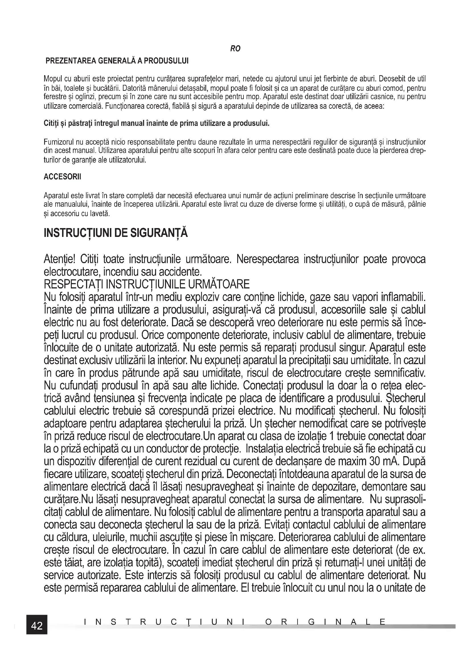 Mopul cu aburii este proiectat pentru curățarea suprafețelor mari, netede cu ajutorul unui jet fi erbinte de aburi. Deosebit de util în băi, toalete și bucătării. Datorită mânerului detașabil, mopul poate fi folosit și ca un aparat de curățare cu aburi comod, pentru ferestre și oglinzi, precum și în zone care nu sunt accesibile pentru mop. Aparatul este destinat doar utilizării casnice, nu pentru utilizare comercială. Funcționarea corectă, fi abilă și sigură a aparatului depinde de utilizarea sa corectă, de aceea: Citiți și păstrați întregul manual înainte de prima utilizare a produsului. Furnizorul nu acceptă nicio responsabilitate pentru daune rezultate în urma nerespectării regulilor de siguranță și instrucțiunilor din acest manual. Utilizarea aparatului pentru alte scopuri în afara celor pentru care este destinată poate duce la pierderea drep- turilor de garanție ale utilizatorului. ACCESORII Aparatul este livrat în stare completă dar necesită efectuarea unui număr de acțiuni preliminare descrise în secțiunile următoare ale manualului, înainte de începerea utilizării. Aparatul este livrat cu duze de diverse forme și utilități, o cup ă de măsură, pâlnie și accesoriu cu lavetă.