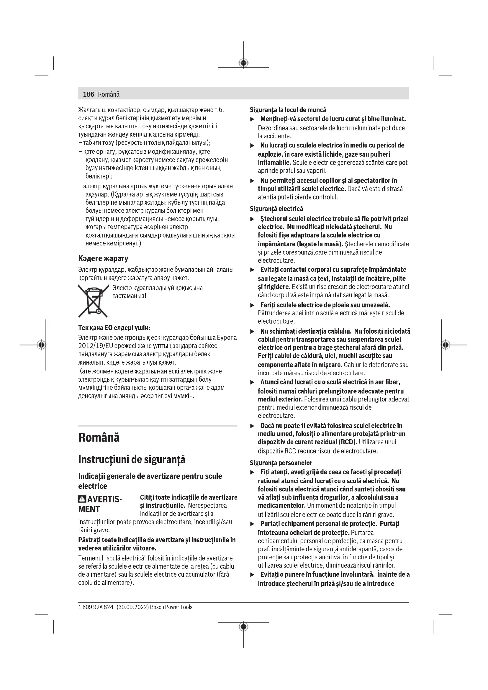 – электр құралына артық жүктеме түскеннен орын алған ақаулар. (Құралға артық жүктеме түсудің шартсыз белгілеріне мыналар жатады: құбылу түсінің пайда болуы немесе электр құралы бөліктері мен түйіндерінің деформациясы немесе қорытылуы, жоғары температура әсерінен электр қозғалтқышындағы сымдар оқшаулағышының қараюы немесе көмірленуі.) Кәдеге жарату Электр құралдар, жабдықтар және бумаларын айналаны қорғайтын кәдеге жаратуға апару қажет. Электр құралдарды үй қоқысына тастамаңыз! Тек қана ЕО елдері үшін: Электр және электрондық ескі құралдар бойынша Еуропа 2012/19/EU ережесі және ұлттық заңдарға сайкес пайдалануға жарамсыз электр құралдары бөлек жиналып, кәдеге жаратылуы қажет. Қате жолмен кәдеге жаратылған ескі электрлік және электрондық құрылғылар қауіпті заттардың болу мүмкіндігіне байланысты қоршаған ортаға және адам денсаулығына зиянды әсер тигізуі мүмкін. Română Instrucţiuni de siguranţă Indicaţii generale de avertizare pentru scule electrice AVERTIS- MENT Citiţi toate indicaţiile de avertizare şi instrucţiunile. Nerespectarea indicaţiilor de avertizare şi a instrucţiunilor poate provoca electrocutare, incendii şi/sau răniri grave. Păstraţi toate indicaţiile de avertizare şi instrucţiunile în vederea utilizărilor viitoare. Termenul "sculă electrică" folosit în indicaţiile de avertizare se referă la sculele electrice alimentate de la reţea (cu cablu de alimentare) sau la sculele electrice cu acumulator (fără cablu de alimentare). Siguranţa la locul de muncă u Menţineţi‑vă sectorul de lucru curat şi bine iluminat. Dezordinea sau sectoarele de lucru neluminate pot duce la accidente. u Nu lucraţi cu sculele electrice în mediu cu pericol de explozie, în care există lichide, gaze sau pulberi inflamabile. Sculele electrice generează scântei care pot aprinde praful sau vaporii. u Nu permiteţi accesul copiilor şi al spectatorilor în timpul utilizării sculei electrice. Dacă vă este distrasă atenţia puteţi pierde controlul. Siguranţă electrică u Ştecherul sculei electrice trebuie să fie potrivit prizei electrice. Nu modificaţi niciodată ştecherul. Nu folosiţi fişe adaptoare la sculele electrice cu împământare (legate la masă). Ştecherele nemodificate şi prizele corespunzătoare diminuează riscul de electrocutare. u Evitaţi contactul corporal cu suprafeţe împământate sau legate la masă ca ţevi, instalaţii de încălzire, plite şi frigidere. Există un risc crescut de electrocutare atunci când corpul vă este împământat sau legat la masă. u Feriţi sculele electrice de ploaie sau umezeală. Pătrunderea apei într‑o sculă electrică măreşte riscul de electrocutare. u Nu schimbaţi destinaţia cablului. Nu folosiţi niciodată cablul pentru transportarea sau suspendarea sculei electrice ori pentru a trage ştecherul afară din priză. Feriţi cablul de căldură, ulei, muchii ascuţite sau componente aflate în mişcare. Cablurile deteriorate sau încurcate măresc riscul de electrocutare. u Atunci când lucraţi cu o sculă electrică în aer liber, folosiţi numai cabluri prelungitoare adecvate pentru mediul exterior. Folosirea unui cablu prelungitor adecvat pentru mediul exterior diminuează riscul de electrocutare. u Dacă nu poate fi evitată folosirea sculei electrice în mediu umed, folosiţi o alimentare protejată printr-un dispozitiv de curent rezidual (RCD). Utilizarea unui dispozitiv RCD reduce riscul de electrocutare. Siguranţa persoanelor u Fiţi atenţi, aveţi grijă de ceea ce faceţi şi procedaţi raţional atunci când lucraţi cu o sculă electrică. Nu folosiţi scula electrică atunci când sunteţi obosiţi sau vă aflaţi sub influenţa drogurilor, a alcoolului sau a medicamentelor. Un moment de neatenţie în timpul utilizării sculelor electrice poate duce la răniri grave. u Purtaţi echipament personal de protecţie. Purtaţi întoteauna ochelari de protecţie. Purtarea echipamentului personal de protecţie, ca masca pentru praf, încălţăminte de siguranţă antiderapantă, casca de protecţie sau protecţia auditivă, în funcţie de tipul şi utilizarea sculei electrice, diminuează riscul rănirilor. u Evitaţi o punere în funcţiune involuntară. Înainte de a introduce ştecherul în priză şi/sau de a introduce 1 609 92A 824 | (30.09.2022) Bosch Power ToolsRomână | 187 acumulatorul în scula electrică, de a o ridica sau de a o transporta, asiguraţi‑vă că aceasta este oprită. Dacă atunci când transportaţi scula electrică ţineţi degetul pe întrerupător sau dacă porniţi scula electrică înainte de a o racorda la reţeaua de curent, puteţi provoca accidente. u Înainte de pornirea sculei electrice îndepărtaţi cleştii de reglare sau cheile fixe din aceasta. O cheie sau un cleşte ataşat la o componentă rotativă a sculei electrice poate provoca răniri. u Nu vă întindeţi pentru a lucra cu scula electrică. Menţineţi-vă întotdeauna stabilitatea şi echilibrul. Astfel veţi putea controla mai bine scula electrică în situaţii neaşteptate. u Purtaţi îmbrăcăminte adecvată. Nu purtaţi îmbrăcăminte largă sau podoabe. Feriţi părul, îmbrăcămintea şi mănuşile de piesele aflate în mişcare. Îmbrăcămin