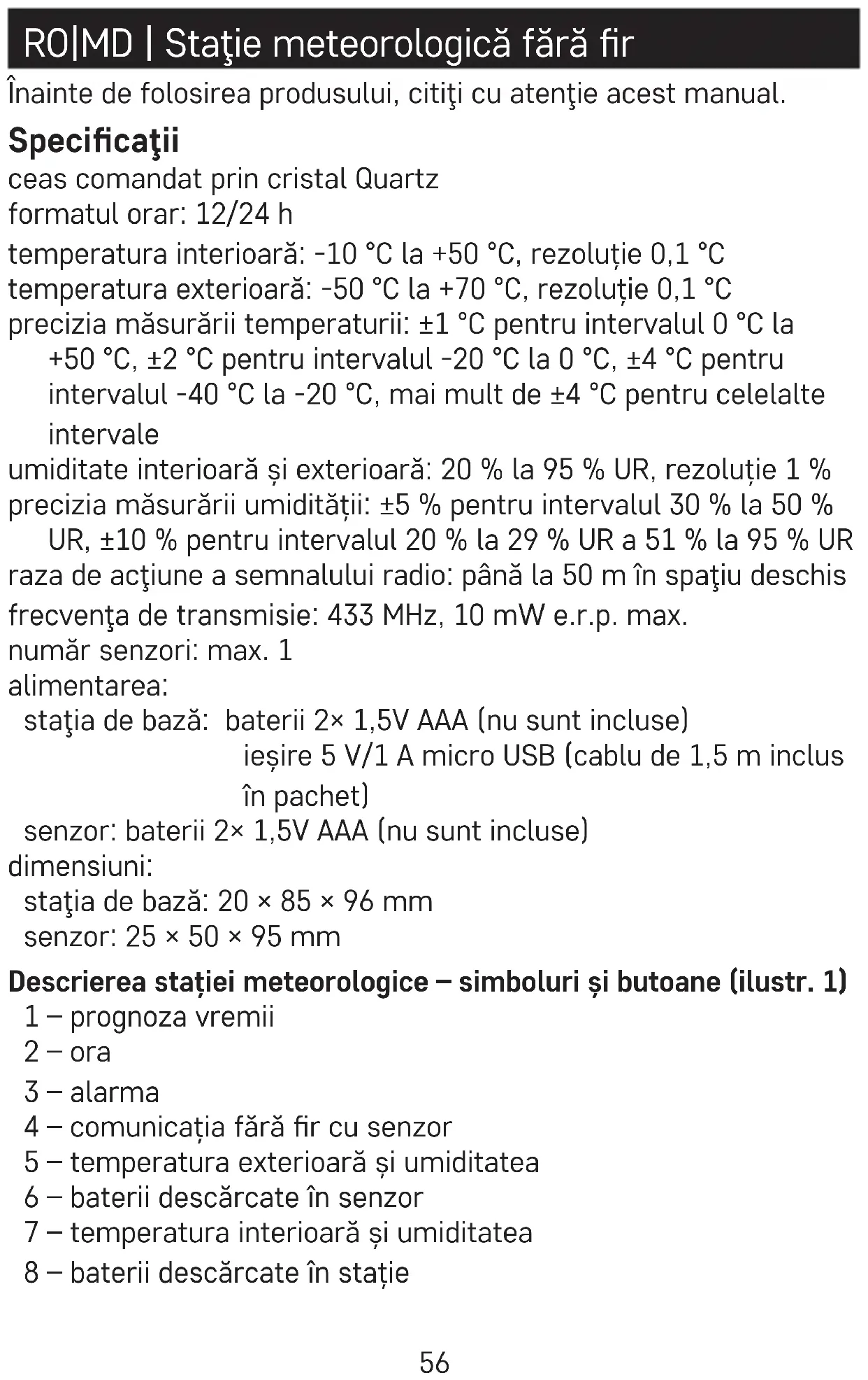 Alarma va reactivată a doua zi. Dacă în timpul sunetului alarmei nu apăsați niciun buton, alarma va înceta să sune peste 2 minute. Aşarea valorilor de temperatură şi umiditate maxime şi minime înregistrate Prin apăsarea butonului vor aşate succesiv valorile maxime (MAX) şi minime (MIN) înregistrate ale temperaturii şi umidităţii exterioare și interioare. Ţinând lung butonul MEMORY, valorile se vor şterge din memorie. Memoria valorilor măsurate se șterge automat în ecare zi la ora 00:00. Pentru ștergerea manuală a memoriei valorilor măsurate apăsați lung butonul în regimul așării max/min. Prognoza vremii însorită înnorată închisă ploaie ninsoare Staţia indică prognoza vremii pe baza modicărilor presiunii atmo- sferice pe următoarele 12–24 ore pe o rază de 15–20 km. Precizia prognozei vremii este de aproximativ 50%. Întrucât prognoza vremii nu poate să coincidă întotdeauna 100%, producătorul nici vânzătorul nu poate responsabil pentru orice daune provocate de prognoza inexactă a vremii. La prima reglare sau după resetarea sta- ţiei meteo durează aproximativ 12 ore până ce staţia meteorologică60 începe să prognozeze corect. Staţia meteorologică indică prognoza vremii cu 5 simboluri. Mențiune: Simbolul așat indică prognoza vremii pe următoarele 12–24 ore. S-ar putea să nu coincidă cu starea actuală a vremii. Indicații de siguranță și atenționări Înainte de folosirea aparatului, citiţi cu atenţie manualul de utilizare. Respectați indicațiile de siguranță cuprinse în acest manual. Produsul este proiectat astfel, ca la o manipulare adecvată să funcţioneze corect ani îndelungaţi.