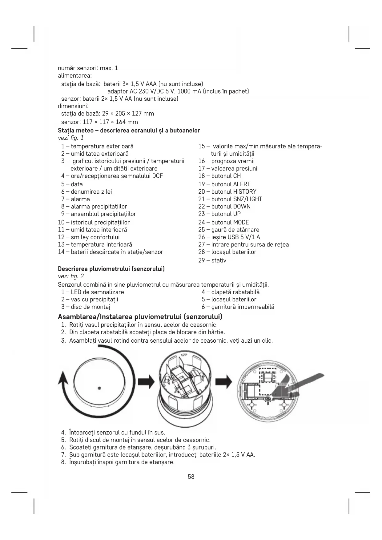 12/24 h – ora – minute – anul – luna – ziua. Între valorile individuale vă deplasați apăsând butonul MODE, reglarea o efectuați cu ajutorul butoanelor UP/DOWN. Limba calendarului este engleza. Setarea unității temperaturii °C/°F Prin apăsarea repetată a butonului UP setați unitățile temperaturii °C/°F. Setarea unității presiunii/precipitațiilor Prin apăsarea repetată a butonului DOWN setați unitatea presiunii și precipitațiilor inHg/inches sau hPa/mm. Presiunea atmosferică Valoarea actuală a presiunii se așează în chenarul nr. 17. Prin apăsarea repetată a butonului DOWN setați unitatea presiunii inHg sau hPa. În cazul mutării stației meteo în alt loc intervine inuențarea valorilor măsurate. Măsurarea se stabilizează în 12 ore de la introducerea bateriilor ori mutare. Simbolul confortului – smiley Se așează în chenarul nr. 12. Mediu confortabil Mediu confortabil Mediu uscat Mediu uscat Mediu umed Tendinţa temperaturii și umidității Indicatorul tendinței temperaturii și umidității în creștere stabilă în scădere Tendinţa vremii Indicatorul tendinței vremii îmbunătățire fără modicări înrăutățire61 Așarea valorilor măsurate ale precipitațiilor și valorilor max/min ale temperaturii și umidității Așarea inițială pe ecran a cantității de precipitații este pentru ziua actuală (today´s). Prin apăsarea repetată a butonului HISTORY așați succesiv: Cantitatea de precipitații – ieri (yesterday), săptămâna actuală (this week), luna actuală (this mon- th), anul actual (this year), anul precedent (last year), valorile max/min ale temperaturii/umidității interioare, valorile max/min ale temperaturii/umidității exterioare. Mențiune: Pentru ștergerea manuală a memoriei valorilor măsurate ale temperaturii și umidității apăsați lung butonul HISTORY în timpul așării istoricului măsurării. În cazul depășirii valorii max. a precipitațiilor 999,99 mm se așează 10.XX și este necesară ștergerea istoricului măsurării. Dacă doriți să ștergeți istoricul măsurării precipitațiilor, este necesară deconectarea sursei/scoaterea bateriilor din stația meteo (stația meteo trebuie reglată din nou manual) Mențiune privind valorile măsurate de pecipitații: Ploaie nă = 0,25 mm/oră Ploaie slabă = 1 mm/oră Ploaie = 4 mm/oră Ploaie puternică = 16 mm/oră Furtună = 35 mm/oră Furtună puternică = 100 mm/oră Gracul istoricului măsurării presiunii / temperaturii exterioare / umidității exterioare În chenarul nr. 3 se așează gracul măsurării presiunii / temperaturii exterioare / umidității exterioare din ultimele 12 ore. Gracul este animat – valorile se așează automat și repetat la ecare 5 secunde. Animația nu se poate opri, nu se poate modica ordinea/setarea valorilor. Dacă doriți să ștergeți istoricul măsurării, este necesară deconectarea sursei/scoaterea bateriilor din stația meteo (stația meteo trebuie reglată din nou manual) Reglarea alarmei Apăsați butonul MODE – se așează AL. Apoi apăsați lung butonul MODE, începe să clipească setarea orei. Cu butoanele UP/DOWN reglați ora alarmei. Valoarea setată o conrmați cu butonul MODE. Pentru activarea alarmei apăsați din nou MODE (este așat AL) și apoi butonul UP/DOWN. Fiind așat simbolul , alarma este activă. Cu altă apăsare a butonului UP/DOWN dezactivați alarma, simbolul nu va așat. Funcția alarmei repetate Sunetul alarmei îl amânați cu 5 minute prin apăsarea butonului SNOOZE/LIGHT amplasat pe partea superioară a stației meteo. Acest buton îl apăsaţi nemijlocit la sunetul alarmei. Va clipi simbolul