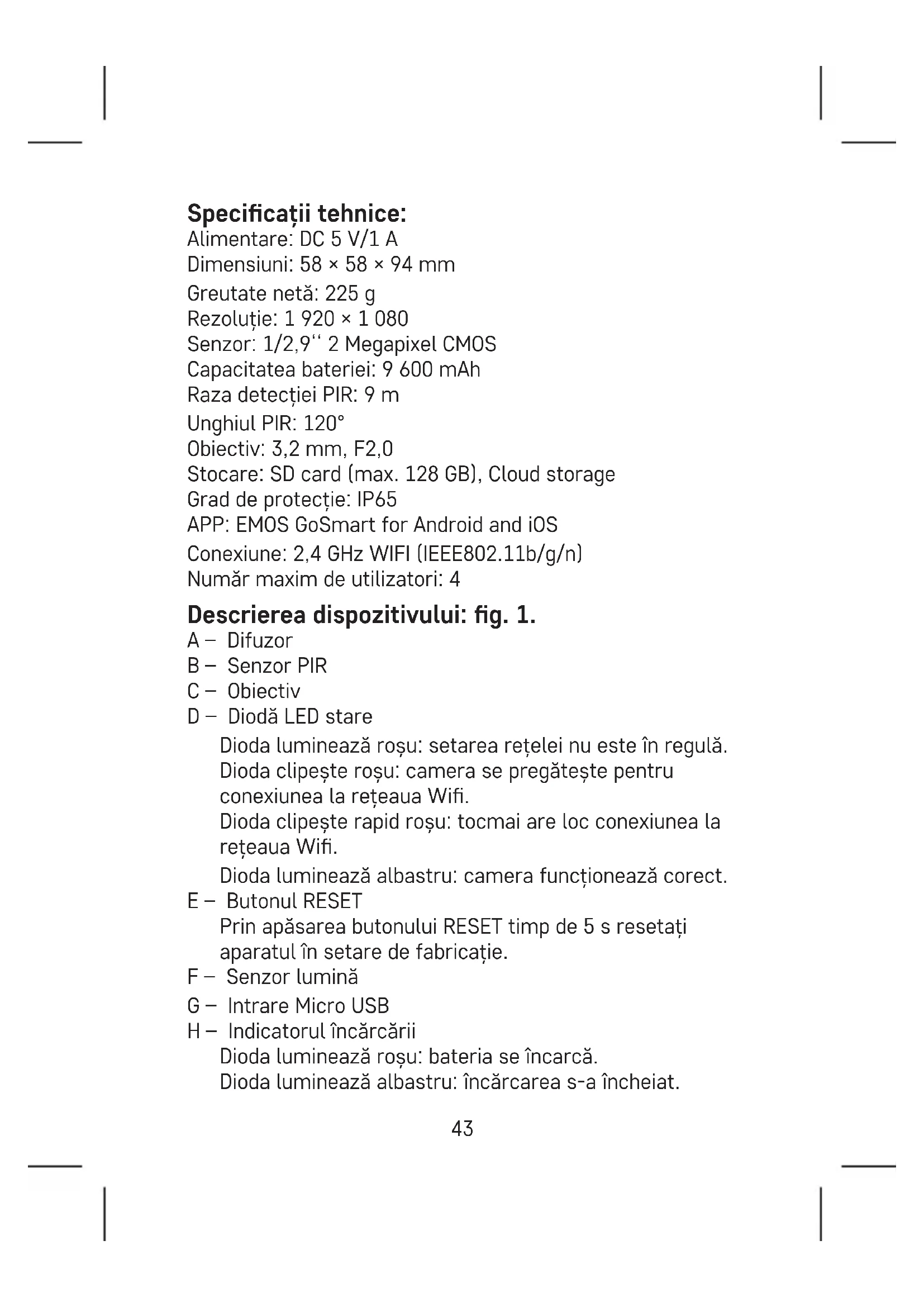 Instalarea aplicației EMOS GoSmart: g. 3 Aplicația este la dispoziție pentru Adroid și iOS prin intermediul Google play și App Store. Pentru descărcarea aplicației vă rog să scanați codul QR corespunzător. Setare router: g. 4 Camera suportă doar 2,4 GHz Wi (nu suportă 5 GHz). Aplicație mobilă EMOS GoSmart: Fig. 5a Accesați aplicația EMOS GoSmart și conrmați principiile de protejare a datelor personale și faceți clic pe accept. Fig. 5b Selectați posibilitatea înregistrării. Fig. 5c Introduceți denumirea adresei de e-mail valabile și alegeți parola. Conrmați acordul cu principiile de protejare a datelor personale. Selectați înregistrare.45 Fig. 6a Selectați posibilitatea adăugării dispozitivului. Fig. 6b Selectați categoria dată de produse. Fig. 6c Selectați acum tipul produsului. Fig. 6d Conectați dispozitivul la rețeaua el. Fig. 6e Asigurați-vă că dioda LED pe dispozitiv clipește. Conrmați cu butonul continuă. Fig. 6f Introduceți denumirea rețelei Wi și parola. Conrmați cu butonul continuă. Fig. 6g Pe ecranul dispozitivului mobil apare codul QR. Codul QR îl amplasați în fața obiectivului camerei video. Conrmați că ați auzit semnalul sonor pentru asocierea cu succes. Fig. 6h Va avea loc detectarea automată a dispozitivului. Fig. 6i Dispozitivul este detectat. Conrmați cu butonul gata. Conectivitate: Wi-Fi 2,4 GHz IEEE 802.11b/g/n Banda de frecvențe: 2,400–2,4835 GHz Prin prezenta, EMOS spol. s r.o. declară că tipul de echipa- mente radio H4053 este în conformitate cu Directiva 2014/53/ UE. Textul integral al declarației UE de conformitate este disponibil la următoarea adresă internet: http://www.emos. eu/download.46 Nu aruncaţi consumatorii electrici la deşeuri comuna- le nesortate, folosiţi bazele de recepţie a deşeurilor sortate. Pentru informaţii actuale privind bazele de recepţie contactaţi organele locale. Dacă consumatorii electrici sunt depozitaţi la stocuri de deşeuri comuna- le, substanţele periculoase se pot in ltra în apele subterane şi pot să ajungă în lanţul alimentar, periclitând sănătatea şi confortul dumneavoastră. LT | IP kamera Pakuotės turinys: Kameros blokas / Elektros energijos adapteris / USB laidas / Magnetinis pagrindas / Sukamasis pagrindas / Varžtų kom- plektas / Naudotojo vadovas Techninės specikacijos: Maitinimo šaltinis: DC 5 V/1 A Matmenys: 58 × 58 × 94 mm Grynasis svoris: 225 g Raiška: 1 920 × 1 080 Jutiklis: 1/2,9‘‘ 2 megapikseliai CMOS Baterijos talpa: 9 600 mAh PIR (pasyvių infraraudonųjų spindulių) aptikimo intervalas: 9 m PIR kampas: 120° Lęšis: 3,2 mm, F2,0 Sandėliavimas: SD kortelė (ne daugiau kaip 128 GB), debesų saugykla Gaubto apsaugos klasė: IP65 Programėlė: „EMOS GoSmart“, skirta „Android“ ir „iOS“ Ryšys: 2,4 GHz belaidis ryšys (IEEE 802,11 b/g/n)47 Maksimalus naudotojų skaičius: 4 Įrenginio aprašymas: 1 pav. A – Garsiakalbis B – PIR jutiklis C – Lęšis D – Būsenos LED Šviečia raudonas LED: netinkamai nustatytas tinklas. Blyksi raudonas LED: kamera laukia, kol prisijungs prie belaidžio ryšio. Greitai blyksi raudonas LED: jungiamasi prie belaidžio ryšio. Blyksi mėlynas LED: kamera veikia tinkamai. E – Mygtukas RESET (nustatyti iš naujo) Nuspaudus ir 5 s palaikius nuspaustą RESET, atkuriami įrenginio gamykliniai nustatymai. F – Šviesos jutiklis G – MikroUSB lizdas H – Įkrovimo indikatorius Šviečia raudonas LED: baterija kraunasi. Šviečia mėlynas LED: įkrovimas baigtas. I – Mikrofonas J – SD kortelės anga (ne daugiau kaip 128 GB) Magnetinio pagrindo montavimas: 2a pav.