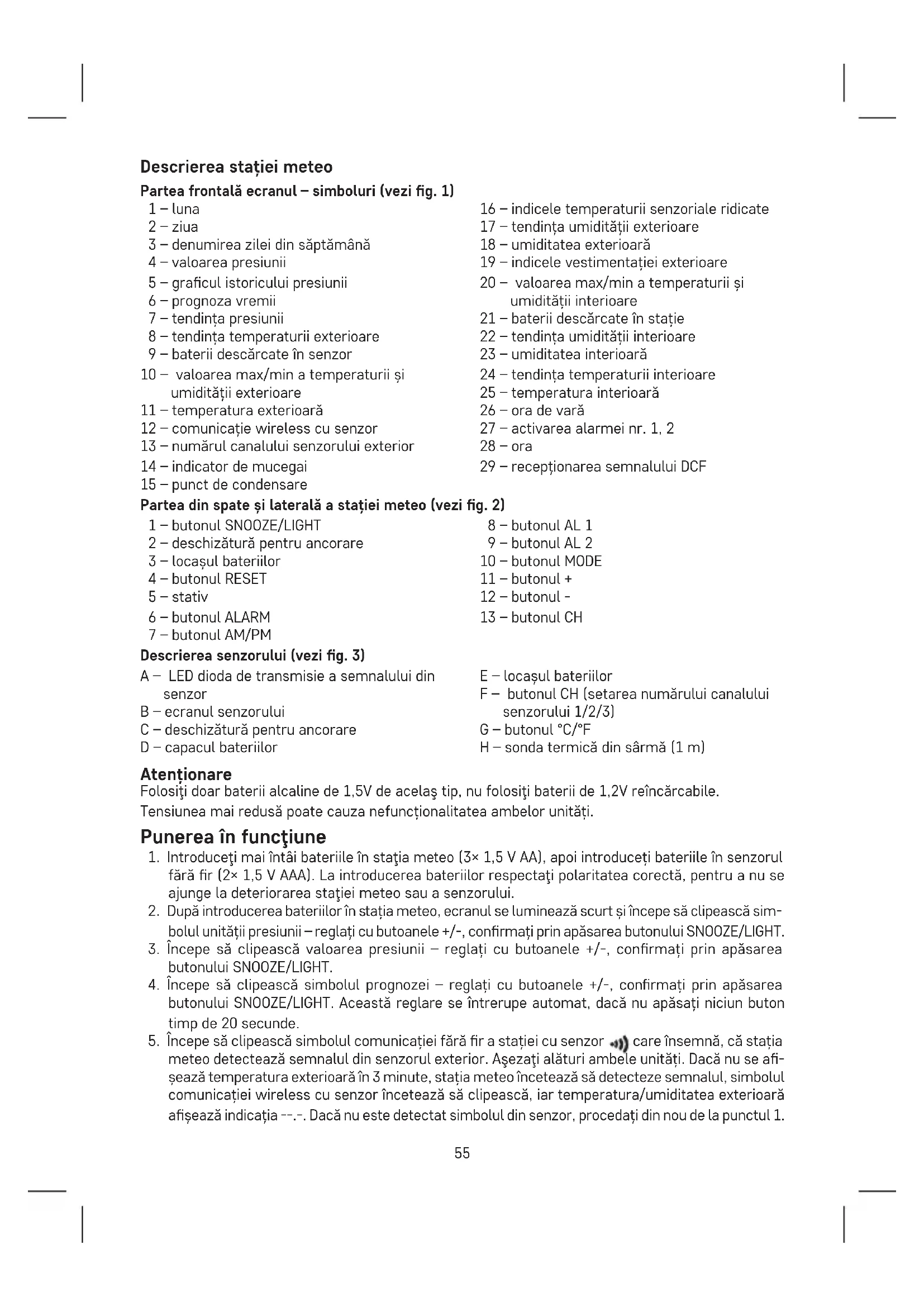fără r (2× 1,5 V AAA). La introducerea bateriilor respectaţi polaritatea corectă, pentru a nu se ajunge la deteriorarea staţiei meteo sau a senzorului.