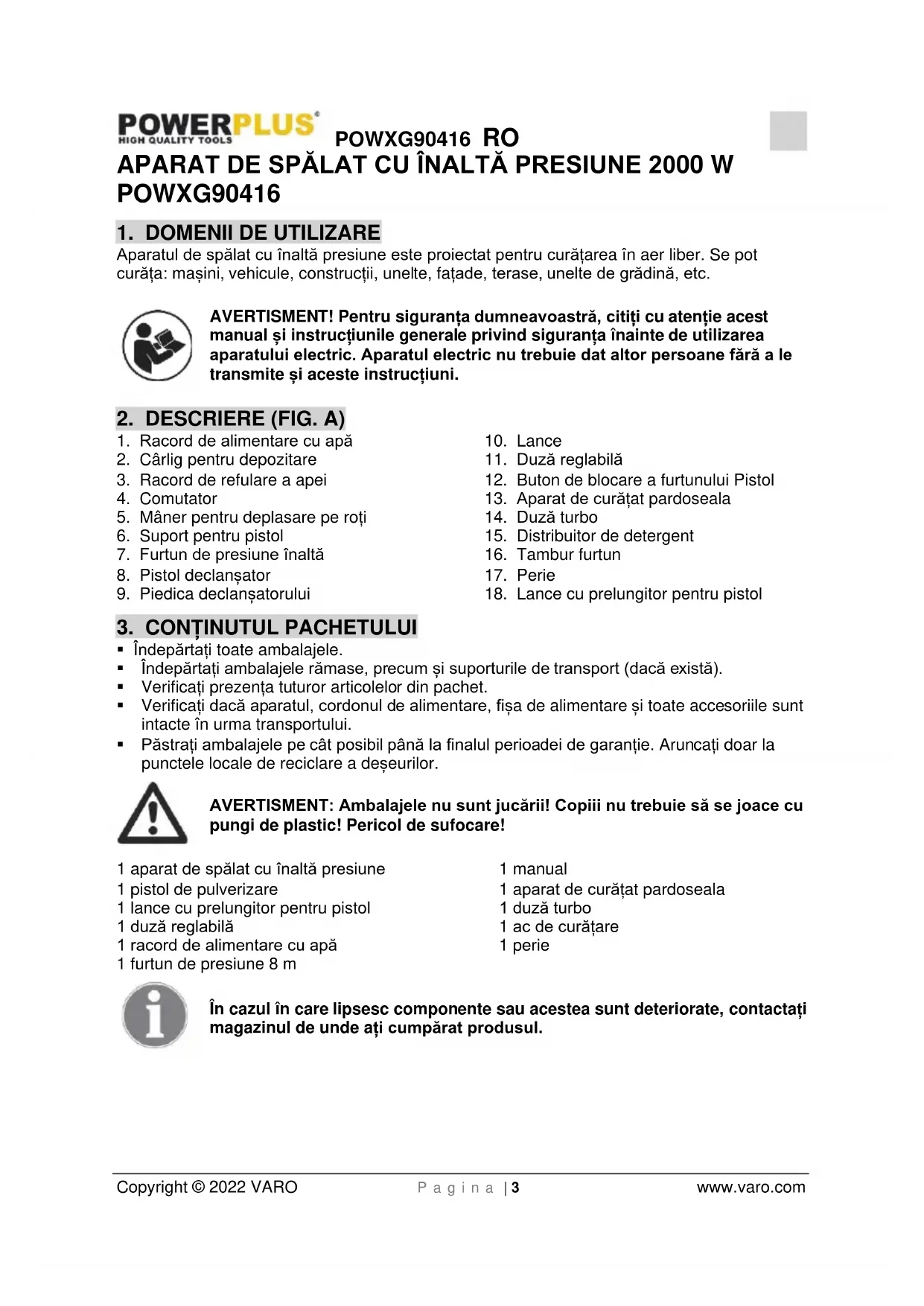 - Păstrați ambalajele pe cât posibil până la finalul perioadei de garanție. Aruncați doar la punctele locale de reciclare a deșeurilor. AVERTISMENT: Ambalajele nu sunt jucării! Copiii nu trebuie să se joace cu pungi de plastic! Pericol de sufocare! 1 aparat de spălat cu înaltă presiune 1 pistol de pulverizare 1 lance cu prelungitor pentru pistol 1 duză reglabilă 1 racord de alimentare cu apă 1 furtun de presiune 8 m 1 manual 1 aparat de curățat pardoseala 1 duză turbo 1 ac de curățare 1 perie În cazul în care lipsesc componente sau acestea sunt deteriorate, contactați magazinul de unde ați cumpărat produsul.POWXG90416 RO Copyright © 2022 VARO P a g i n a | 4 www.varo.com