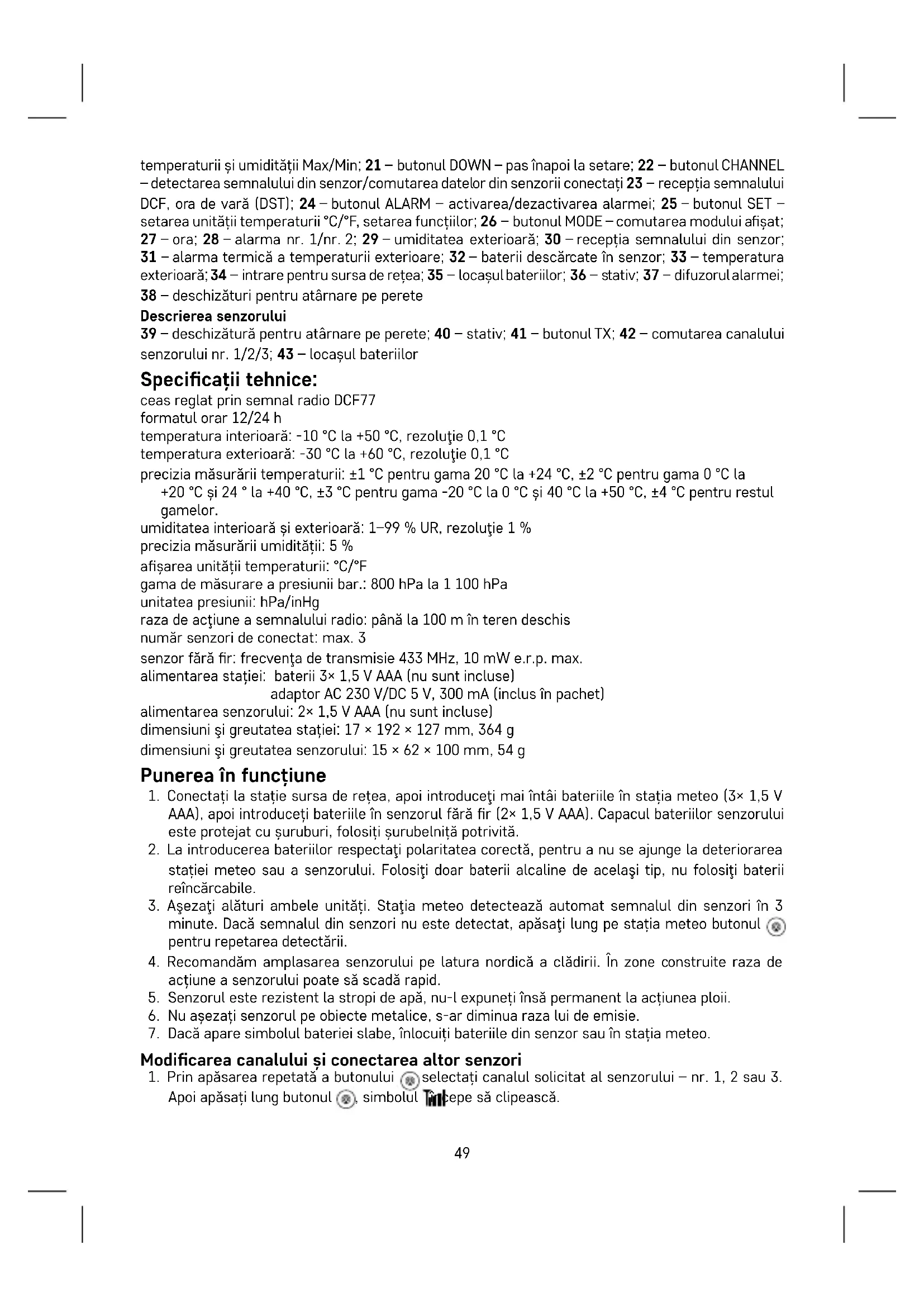 stației meteo sau a senzorului. Folosiţi doar baterii alcaline de acelaşi tip, nu folosiţi baterii reîncărcabile.