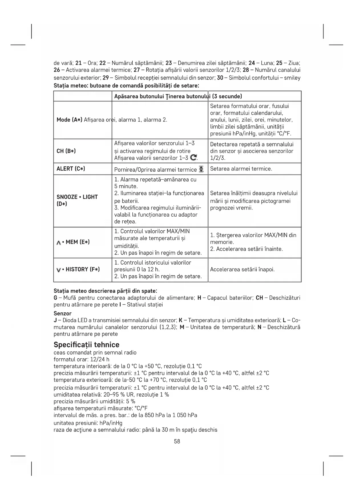 Accelerarea setării înapoi. Stația meteo descrierea părții din spate: G – Mufă pentru conectarea adaptorului de alimentare; H – Capacul bateriilor; CH – Deschizături pentru atârnare pe perete I – Stativul stației Senzor J – Dioda LED a transmisiei semnalului din senzor; K – Temperatura și umiditatea exterioară; L – Co- mutarea numărului canalelor senzorului (1,2,3); M – Unitatea de temperatură; N – Deschizătură pentru atârnare pe perete Specicații tehnice ceas comandat prin semnal radio formatul orar: 12/24 h temperatura interioară: de la 0 °C la +50 °C, rezoluție 0,1 °C precizia măsurării temperaturii: ±1 °C pentru intervalul de la 0 °C la +40 °C, altfel ±2 °C temperatura exterioară: de la-50 °C la +70 °C, rezoluție 0,1 °C precizia măsurării temperaturii: ±1 °C pentru intervalul de la 0 °C la +40 °C, altfel ±2 °C umiditatea relativă: 20–95 % UR, rezoluție 1 % precizia măsurării umidității: 5 % așarea temperaturii măsurate: °C/°F intervalul de măs. a pres. bar.: de la 850 hPa la 1 050 hPa unitatea presiunii: hPa/inHg raza de acţiune a semnalului radio: până la 30 m în spaţiu deschis59 număr senzori fără r: max. 3 senzor fără r: frecvenţa de transmisie 433 MHz, 10 mW e.r.p. max. lungimea sondei de sârmă: 1 m alimentarea stației: baterii 3× 1,5 V AAA (nu sunt incluse) adaptor AC 230 V/DC 5 V (inclus în pachet) alimentarea senzorului: 2× 1,5 V AAA (nu sunt incluse) dimensiunile şi greutatea stației: 193 × 144 × 50 mm, 364 g dimensiunile şi greutatea senzorului: 60 × 100 × 21 mm, 54 g Punerea în funcțiune