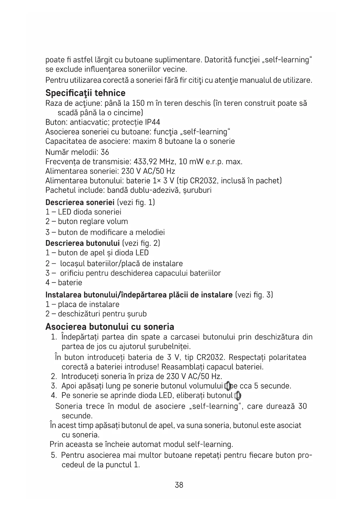 - Controlaţi din când în când funcţionarea butonului soneriei şi înlocuiţi din timp bateriile. Folosiţi doar baterii alcaline de calitate cu parametri prevăzuţi.41