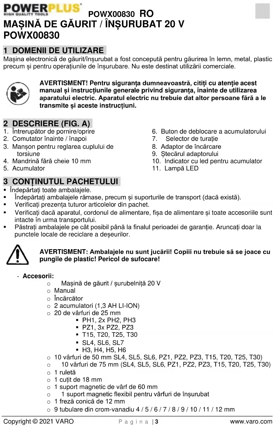 - Depozitați aparatul oprit departe de îndemâna copiilor și nu permiteți persoanelor nefamiliarizate cu acesta sau cu instrucțiunile sale să lucreze cu aparatul. Aparatele electrice sunt potențial periculoase dacă sunt folosite de persoane neinstruite.POWX00830 RO Copyright © 2021 VARO P a g i n a | 6 www.varo.com