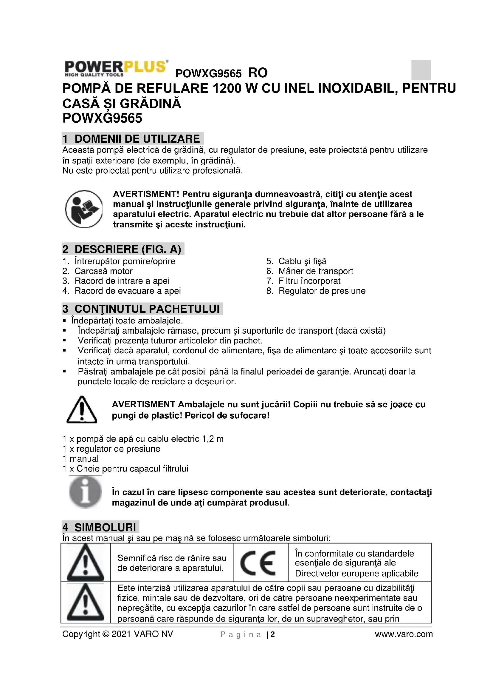 VARO N.V. - Vic. Van Rompuy N.V.- Joseph Van Instraat 9 - BE2500 Lier - BELGIA, declară că produsul: Pompă De Refulare 1200 W Cu Inel Inoxidabil, Pentru Casă Și Grădină marcă înregistrată: POWERplus model: POWXG9565 este în conformitate cu specificaţiile esenţiale şi alte prevederi relevante ale Directivelor Europene aplicabile, pe baza aplicării standardelor europene armonizate. Orice modificare neautorizată a aparatelor atrage după sine anularea acestei declaraţii. Directivele europene (inclusiv, dacă este cazul, amendamentele lor, până la data semnăturii): 2014/30/EC 2014/35/EC 2011/65/EU 2000/14/EC Annex V LwA Measured 82dB(A) Guaranteed 83dB(A) Standardele europene armonizate (inclusiv, dacă este cazul, amendamentele lor, până la data semnăturii): EN60335-1 : 2012 EN60335-2-41 : 2003 EN55014-1 : 2017 EN55014-2 : 2015