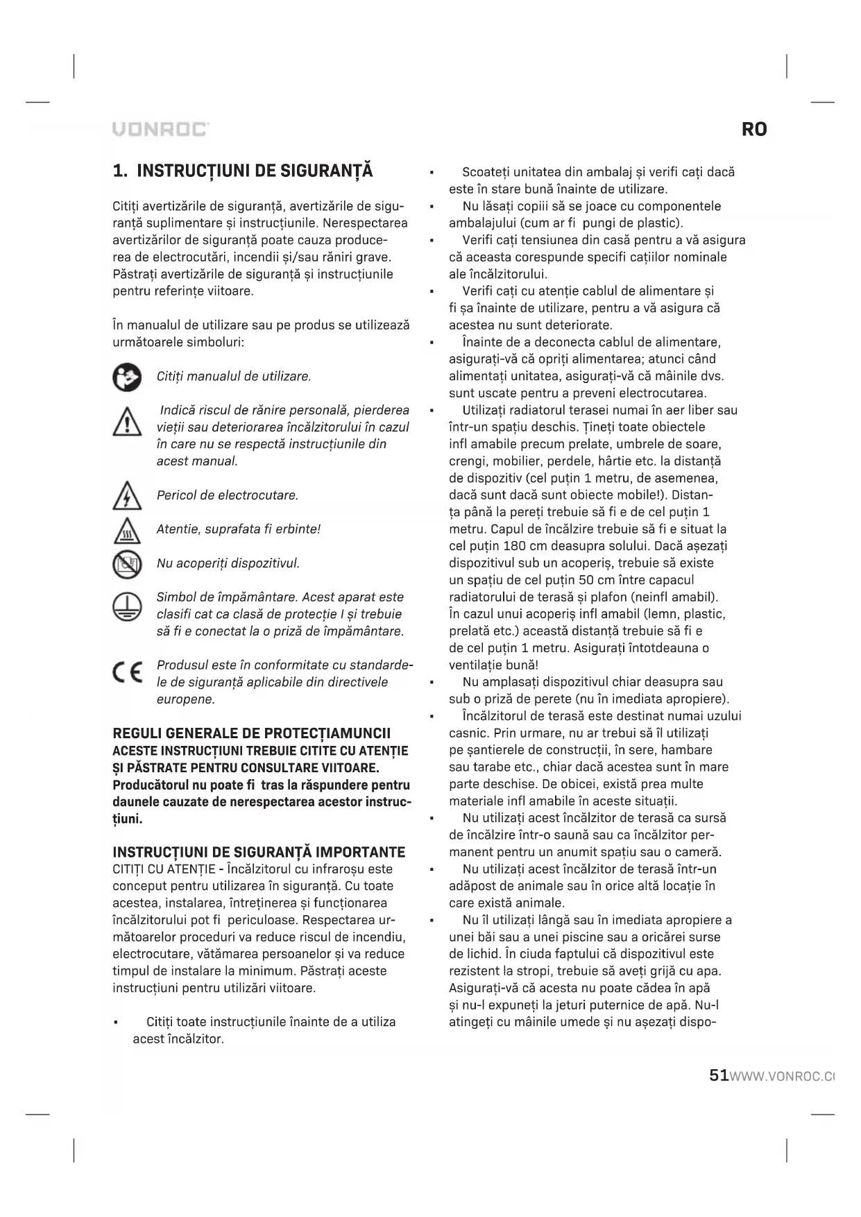 Citiți avertizările de siguranță, avertizările de sigu- ranță suplimentare și instrucțiunile. Nerespectarea avertizărilor de siguranță poate cauza produce- rea de electrocutări, incendii și/sau răniri grave. Păstrați avertizările de siguranță și instrucțiunile pentru referințe viitoare. În manualul de utilizare sau pe produs se utilizează următoarele simboluri: Citiți manualul de utilizare. Indică riscul de rănire personală, pierderea vieții sau deteriorarea încălzitorului în cazul în care nu se respectă instrucțiunile din acest manual. Pericol de electrocutare. Atentie, suprafata fi erbinte! Nu acoperiți dispozitivul. Simbol de împământare. Acest aparat este clasifi cat ca clasă de protecție I și trebuie să fi e conectat la o priză de împământare. Produsul este în conformitate cu standarde- le de siguranță aplicabile din directivele europene.