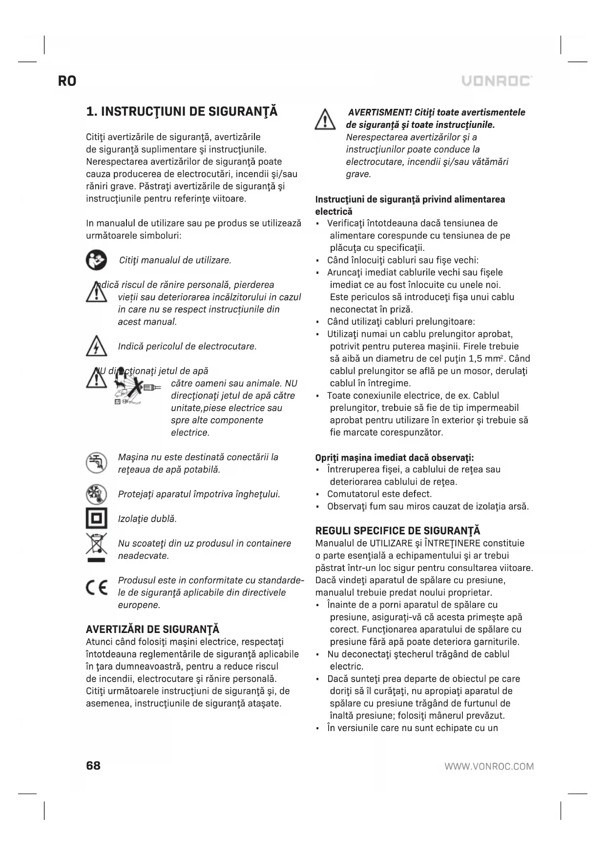 PW503AC - Spălător cu presiune Vonroc - Manual de utilizare gratuit