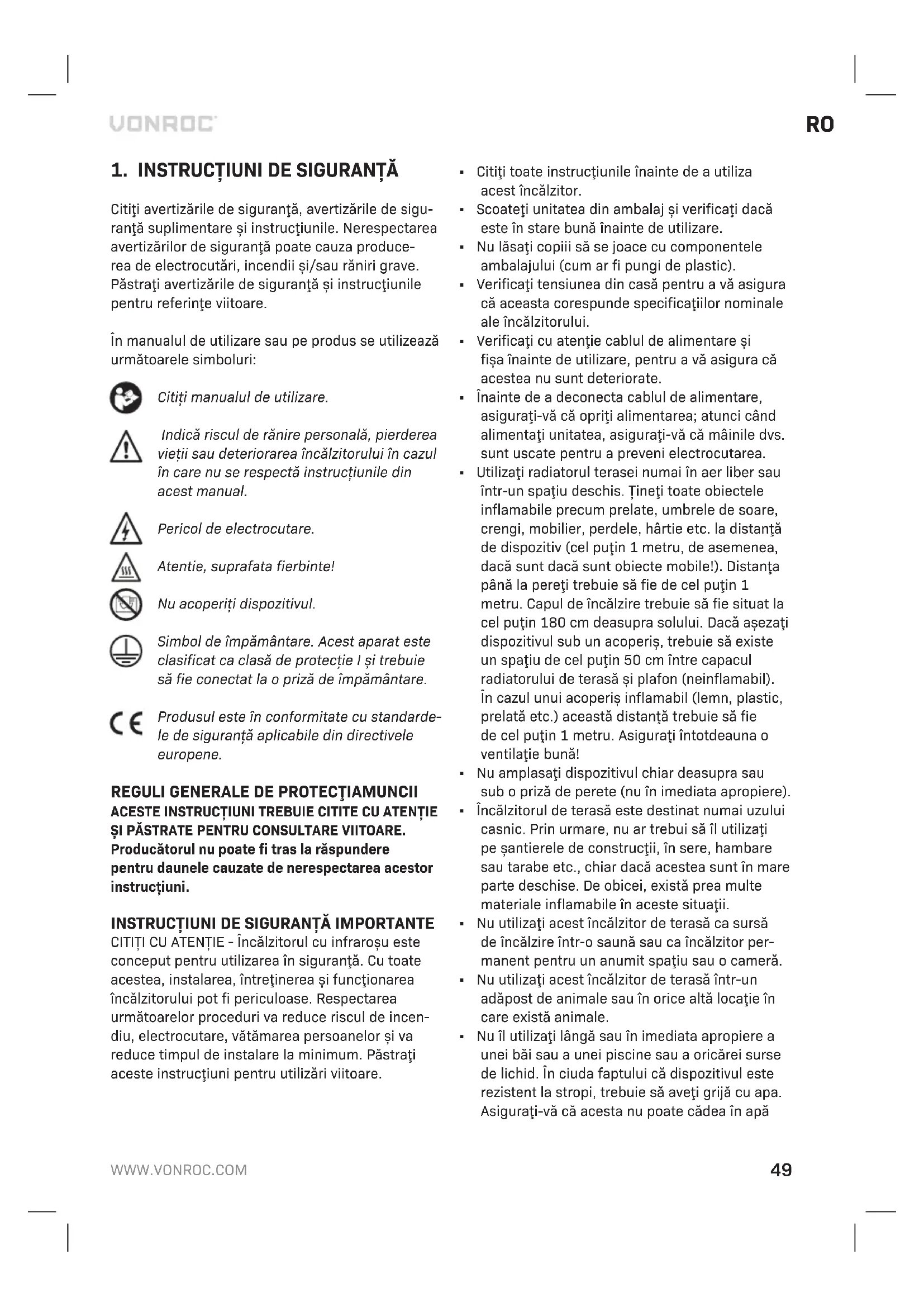 Citiţi avertizările de siguranţă, avertizările de sigu- ranţă suplimentare şi instrucţiunile. Nerespectarea avertizărilor de siguranţă poate cauza produce- rea de electrocutări, incendii şi/sau răniri grave. Păstraţi avertizările de siguranţă şi instrucţiunile pentru referinţe viitoare. În manualul de utilizare sau pe produs se utilizează următoarele simboluri: Citiţi manualul de utilizare. Indică riscul de rănire personală, pierderea vieţii sau deteriorarea încălzitorului în cazul în care nu se respectă instrucţiunile din acest manual. Pericol de electrocutare. Atentie, suprafata fierbinte! Nu acoperiţi dispozitivul. Simbol de împământare. Acest aparat este clasificat ca clasă de protecţie I și trebuie să fie conectat la o priză de împământare. Produsul este în conformitate cu standarde- le de siguranţă aplicabile din directivele europene.