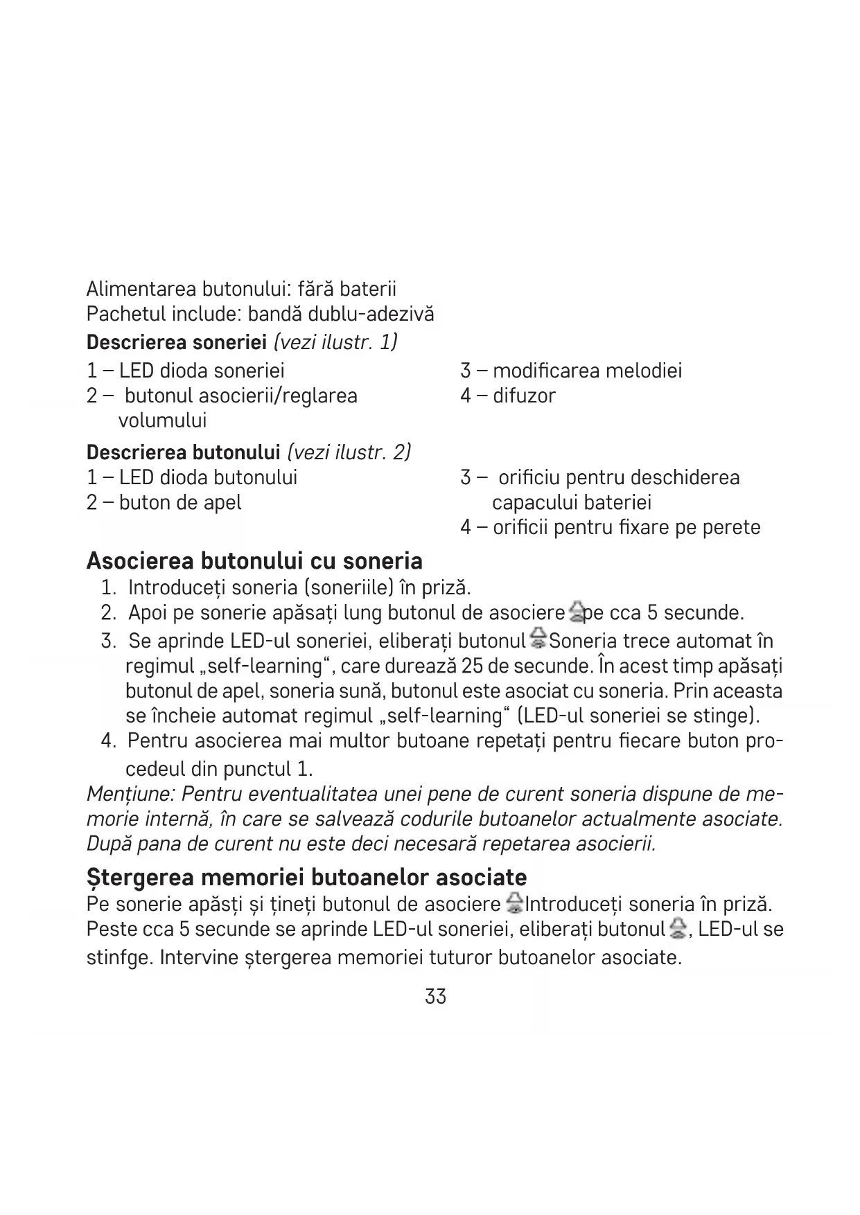 cedeul din punctul 1. Mențiune: Pentru eventualitatea unei pene de curent soneria dispune de me- morie internă, în care se salvează codurile butoanelor actualmente asociate. După pana de curent nu este deci necesară repetarea asocierii. Ștergerea memoriei butoanelor asociate Pe sonerie apăsți și țineți butonul de asociere . Introduceți soneria în priză. Peste cca 5 secunde se aprinde LED-ul soneriei, eliberați butonul , LED-ul se stinfge. Intervine ștergerea memoriei tuturor butoanelor asociate.34 Instalarea butonului soneriei (emițătorului)