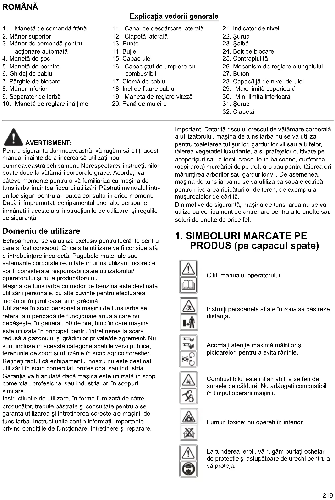 Pouze pro evropské země Prohlášení o shodě pro ES je k tomuto návodu k použití připojeno jako Příloha A.219 ROMÂNĂ Explicaţia vederii generale AVERTISMENT: Pentru siguranţa dumneavoastră, vă rugăm să citiţi acest manual înainte de a încerca să utilizaţi noul dumneavoastră echipament. Nerespectarea instrucţiunilor poate duce la vătămări corporale grave. Acordaţi-vă câteva momente pentru a vă familiariza cu maşina de tuns iarba înaintea fiecărei utilizări. Păstraţi manualul într- un loc sigur, pentru a-l putea consulta în orice moment. Dacă îi împrumutaţi echipamentul unei alte persoane, înmânaţi-i acesteia şi instrucţiunile de utilizare, şi regulile de siguranţă. Domeniu de utilizare Echipamentul se va utiliza exclusiv pentru lucrările pentru care a fost conceput. Orice altă utilizare va fi considerată o întrebuinţare incorectă. Pagubele materiale sau vătămările corporale rezultate în urma utilizării incorecte vor fi considerate responsabilitatea utilizatorului/ operatorului şi nu a producătorului. Maşina de tuns iarba cu motor pe benzină este destinată utilizării personale, cu alte cuvinte pentru efectuarea lucrărilor în jurul casei şi în grădină. Utilizarea în scop personal a maşinii de tuns iarba se referă la o perioadă de funcţionare anuală care nu depăşeşte, în general, 50 de ore, timp în care maşina este utilizată în principal pentru întreţinerea la scară redusă a gazonului şi grădinilor private/de agrement. Nu sunt incluse în această categorie spaţiile verzi publice, terenurile de sport şi utilizările în scop agricol/forestier. Reţineţi faptul că echipamentul nostru nu este destinat utilizării în scop comercial, profesional sau industrial. Garanţ ia va fi anulată dacă maşina est e utilizată în scop comercial, profesional sau industrial ori în scopuri similare. Instrucţiunile de utilizare, în forma furnizată de către producător, trebuie păstrate şi consultate pentru a se garanta utilizarea şi întreţinerea corecte ale maşinii de tuns iarba. Instrucţiunile conţin informaţii importante privind condiţiile de funcţionare, întreţinere şi reparare. Important! Datorită riscului crescut de vătămare corporală a utilizatorului, maşina de tuns iarba nu se va utiliza pentru toaletarea tufişurilor, gardurilor vii sau a tufelor, tăierea vegetaţiei luxuriante, a suprafeţelor cultivate pe acoperişuri sau a ierbii crescute în balcoane, curăţarea (aspirarea) murdăriei de pe trotuare sau pentru tăierea ori mărunţirea arborilor sau gardurilor vii. De asemenea, maşina de tuns iarba nu se va utiliza ca sapă electrică pentru nivelarea ridicăturilor de teren, de exemplu a muşuroaielor de cârtiţă. Din motive de siguranţă, maşina de tuns iarba nu se va utiliza ca echipament de antrenare pentru alte unelte sau seturi de unelte de orice fel.