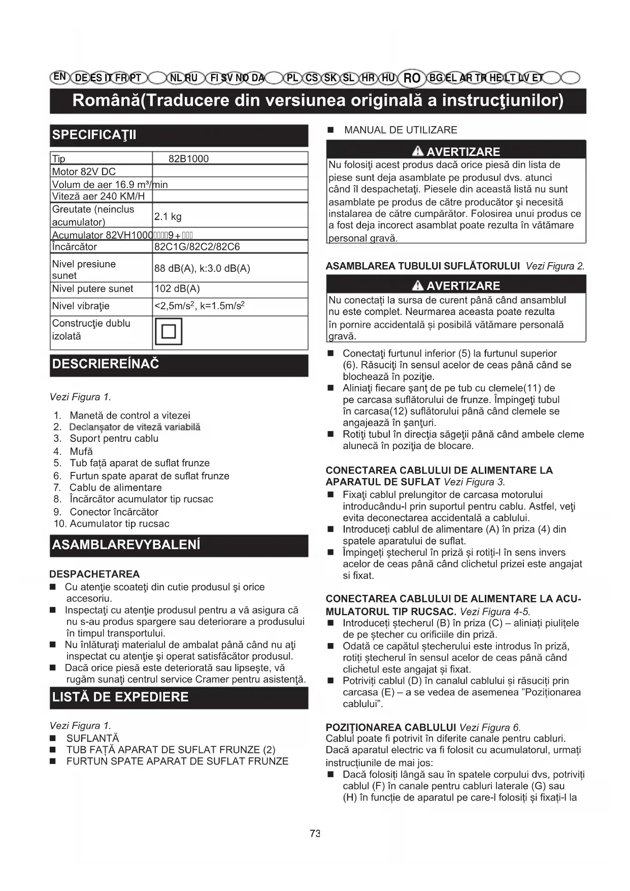 BG EL AR TR HE LT LV ET SPECIFICAŢII Tip 82B1000Motor 82V DCVolum de aer 16.9 m³/minViteză aer 240 KM/HGreutate (neinclusacumulator)2.1 kgAcumulator 82VH10009+Încărcător 82C1G/82C2/82C6Nivel presiunesunet88 dB(A), k:3.0 dB(A)Nivel putere sunet 102 dB(A)Nivel vibraţie <2,5m/s , k=1.5m/s Construcţie dublu izolată DESCRIEREÍNAČ Vezi Figura 1.1. Manetă de control a vitezei 3. Suport pentru cablu4. Mufă5. Tub față aparat de suat frunze6. Furtun spate aparat de suat frunze7. Cablu de alimentare8. Încărcător acumulator tip rucsac9. Conector încărcător10. Acumulator tip rucsac ASAMBLAREVYBALENÍ DESPACHETAREA Cu atenţie scoateţi din cutie produsul şi orice accesoriu. Inspectaţi cu atenţie produsul pentru a vă asigura că nu s-au produs spargere sau deteriorare a produsului în timpul transportului. Nu înlăturaţi materialul de ambalat până când nu aţi inspectat cu atenţie şi operat satisfăcător produsul. Dacă orice piesă este deteriorată sau lipseşte, vă rugăm sunaţi centrul service Cramer pentru asistenţă.