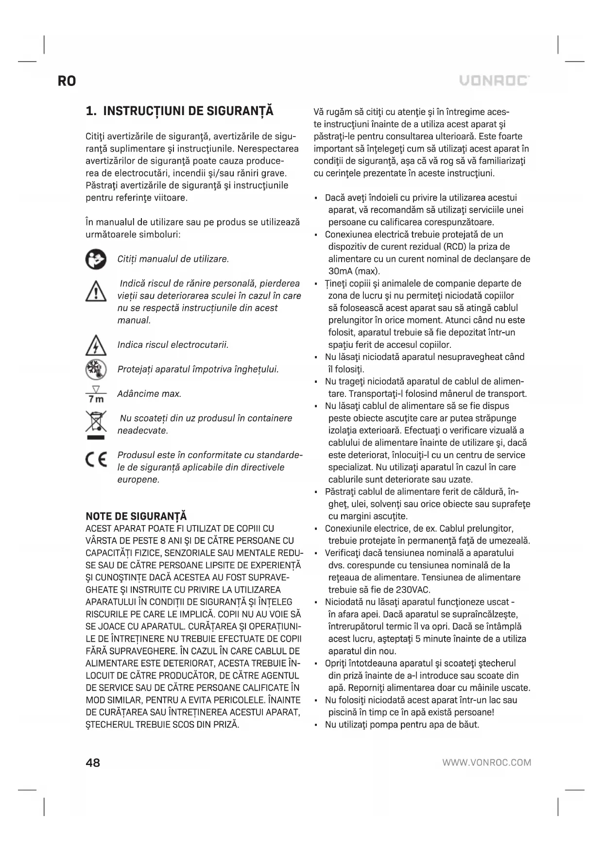 Pompa nu va porni sau se va opri în timpul utilizării. Pompa oprită după scurte perioade de funcionare Comutatorul de sigurană la suprasarcină termică a fost activat Alimentarea s-a declanşat Turbină înfundată Apa este prea fierbinte Deconectai-vă de la sursa de alimentare, lăsai 2 minute şi curăai turbina (dacă este ne- cesar - consultai „Blocajele”) Verificai sigu- ranele şi conexi- unile electrice Deconectai pom- pa de la sursa de alimentare şi curăai sau deblocai turbina (consultai „BLO- CAJELE”) Asigurai-vă că temperatura apei nu a depăşit maximum 35°C MEDIU Aparatele electrice sau electronice deteriorate şi/sau defecte trebuie colectate în locurile de reciclare corespunzătoare. Numai pentru ţările din CE Nu aruncai echipamentele acionate electric îm- preună cu gunoiul menajer. Conform Indicaiei eu- ropene 2012/19/EU pentru echipamente electrice și electronice uzate și a implementării sale la nivel naional, echipamentele acionate electric scoase din uz trebuie colectate separat și evacuate într-o manieră ecologică. GARANŢIE Produsele VONROC sunt realizate la cele mai înalte standarde de calitate și sunt garantate în privin- a materialelor și a manoperei pentru întreaga perioadă de utilizare în garanie, începând cu data achiziiei. În cazul în care produsul se defectează în timpul perioadei de utilizare, contactai direct VONROC. Următoarele circumstane sunt excluse de la această garanie: