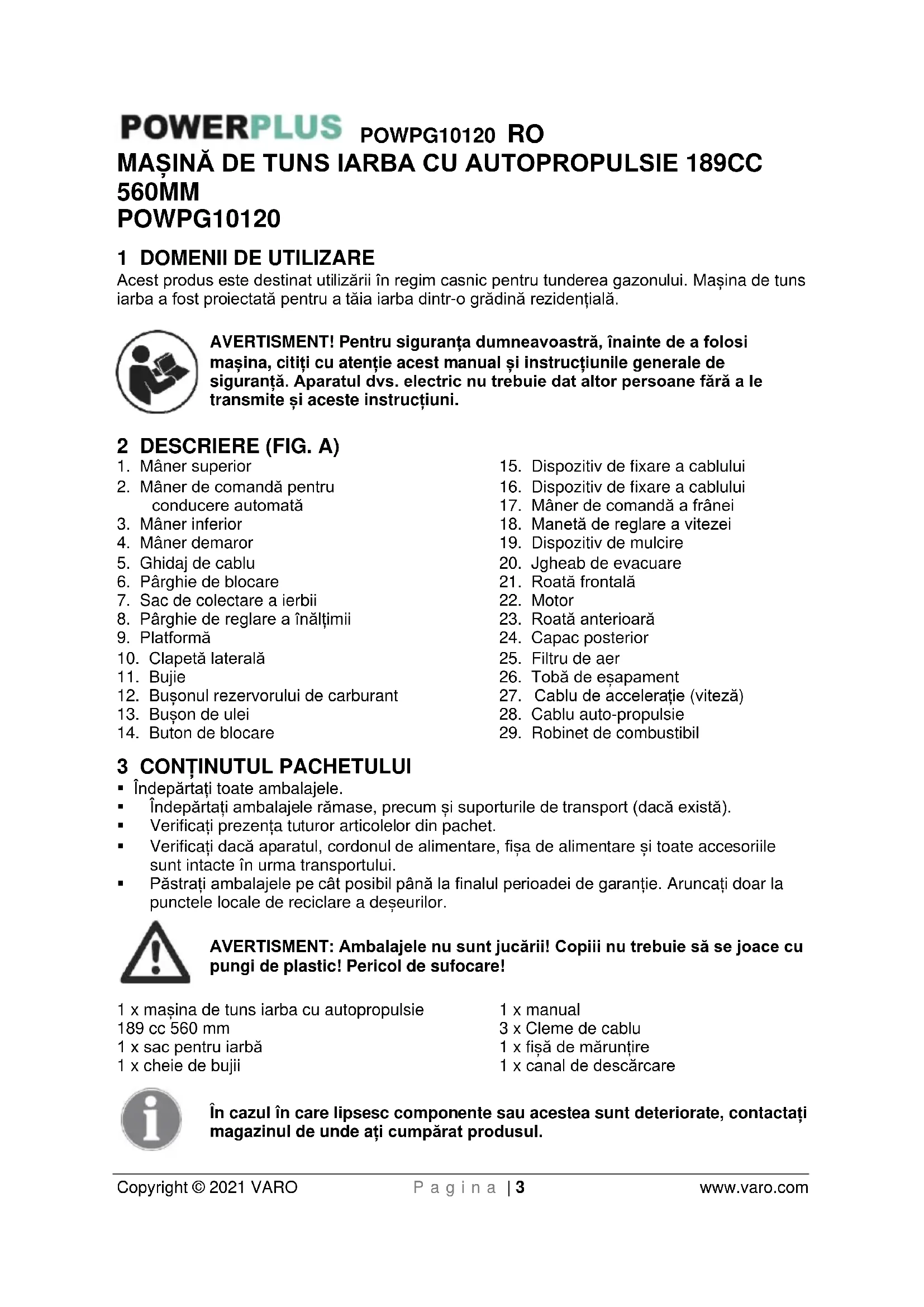 - Înainte de depozitarea în spații închise, lăsați motorul să se răcească.POWPG10120 RO Copyright © 2021 VARO P a g i n a | 7 www.varo.com