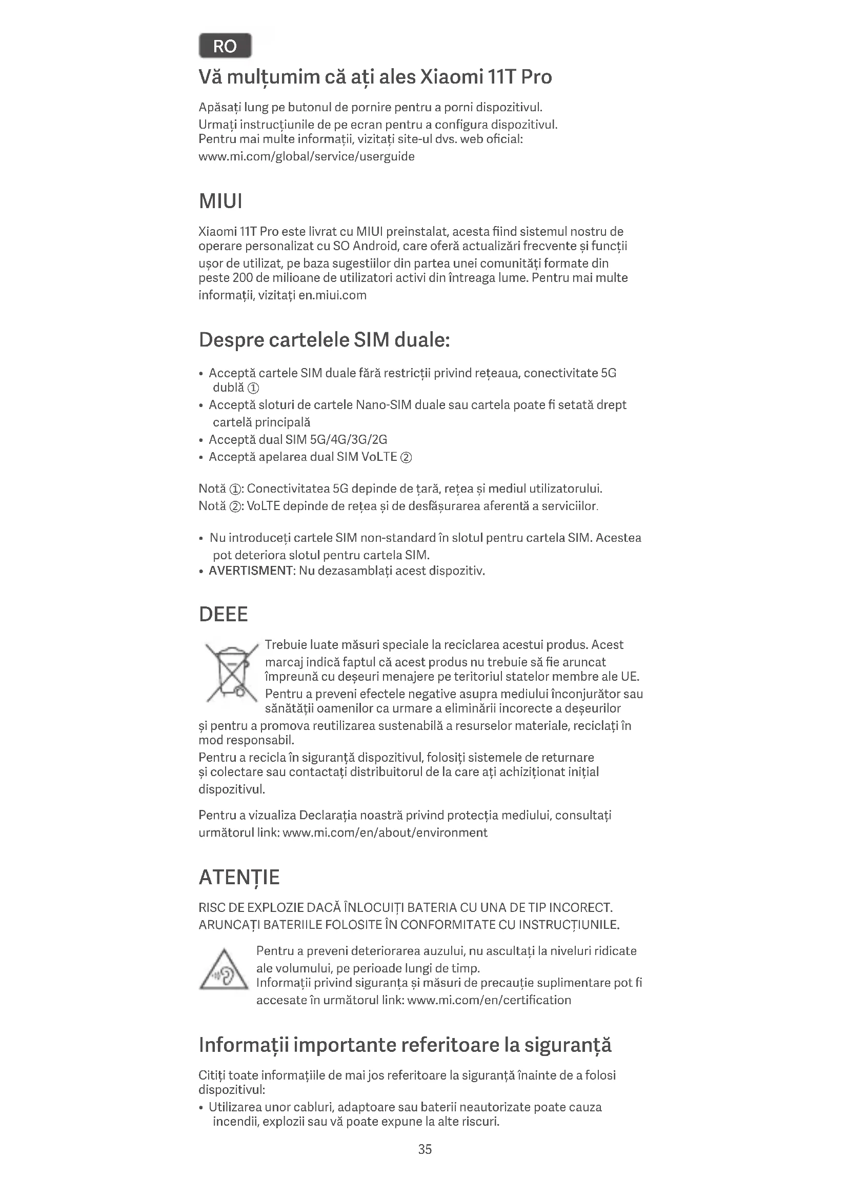 - AVERTISMENT: Nu dezasamblați acest dispozitiv. DEEE Trebuie luate măsuri speciale la reciclarea acestui produs. Acest marcaj indică faptul că acest produs nu trebuie să fie aruncat împreună cu deșeuri menajere pe teritoriul statelor membre ale UE. Pentru a preveni efectele negative asupra mediului înconjurător sau sănătății oamenilor ca urmare a eliminării incorecte a deșeurilor și pentru a promova reutilizarea sustenabilă a resurselor materiale, reciclați în mod responsabil. Pentru a recicla în siguranță dispozitivul, folosiți sistemele de returnare și colectare sau contactați distribuitorul de la care ați achiziționat inițial dispozitivul. Pentru a vizualiza Declarația noastră privind protecția mediului, consultați următorul link: www.mi.com/en/about/environment ATENȚIE RISC DE EXPLOZIE DACĂ ÎNLOCUIȚI BATERIA CU UNA DE TIP INCORECT. ARUNCAȚI BATERIILE FOLOSITE ÎN CONFORMITATE CU INSTRUCȚIUNILE. Pentru a preveni deteriorarea auzului, nu ascultați la niveluri ridicate ale volumului, pe perioade lungi de timp. Informații privind siguranța și măsuri de precauție suplimentare pot fi accesate în următorul link: www.mi.com/en/certification Informații importante referitoare la siguranță Citiți toate informațiile de mai jos referitoare la siguranță înainte de a folosi dispozitivul: