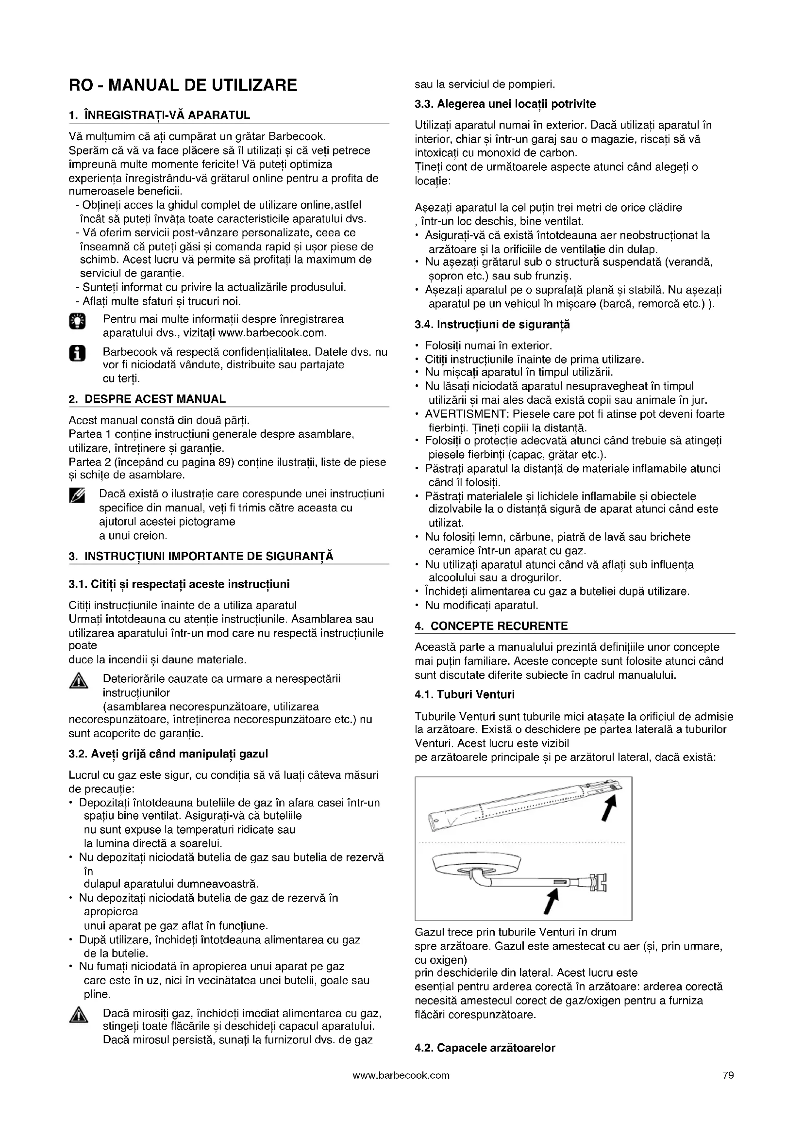 Această parte a manualului prezintă denițiile unor concepte mai puțin familiare. Aceste concepte sunt folosite atunci când sunt discutate diferite subiecte în cadrul manualului. 4.1. Tuburi Venturi Tuburile Venturi sunt tuburile mici atașate la oriciul de admisie la arzătoare. Există o deschidere pe partea laterală a tuburilor Venturi. Acest lucru este vizibil pe arzătoarele principale și pe arzătorul lateral, dacă există: Gazul trece prin tuburile Venturi în drum spre arzătoare. Gazul este amestecat cu aer (și, prin urmare, cu oxigen) prin deschiderile din lateral. Acest lucru este esențial pentru arderea corectă în arzătoare: arderea corectă necesită amestecul corect de gaz/oxigen pentru a furniza ăcări corespunzătoare. 4.2. Capacele arzătoarelorwww.barbecook.com