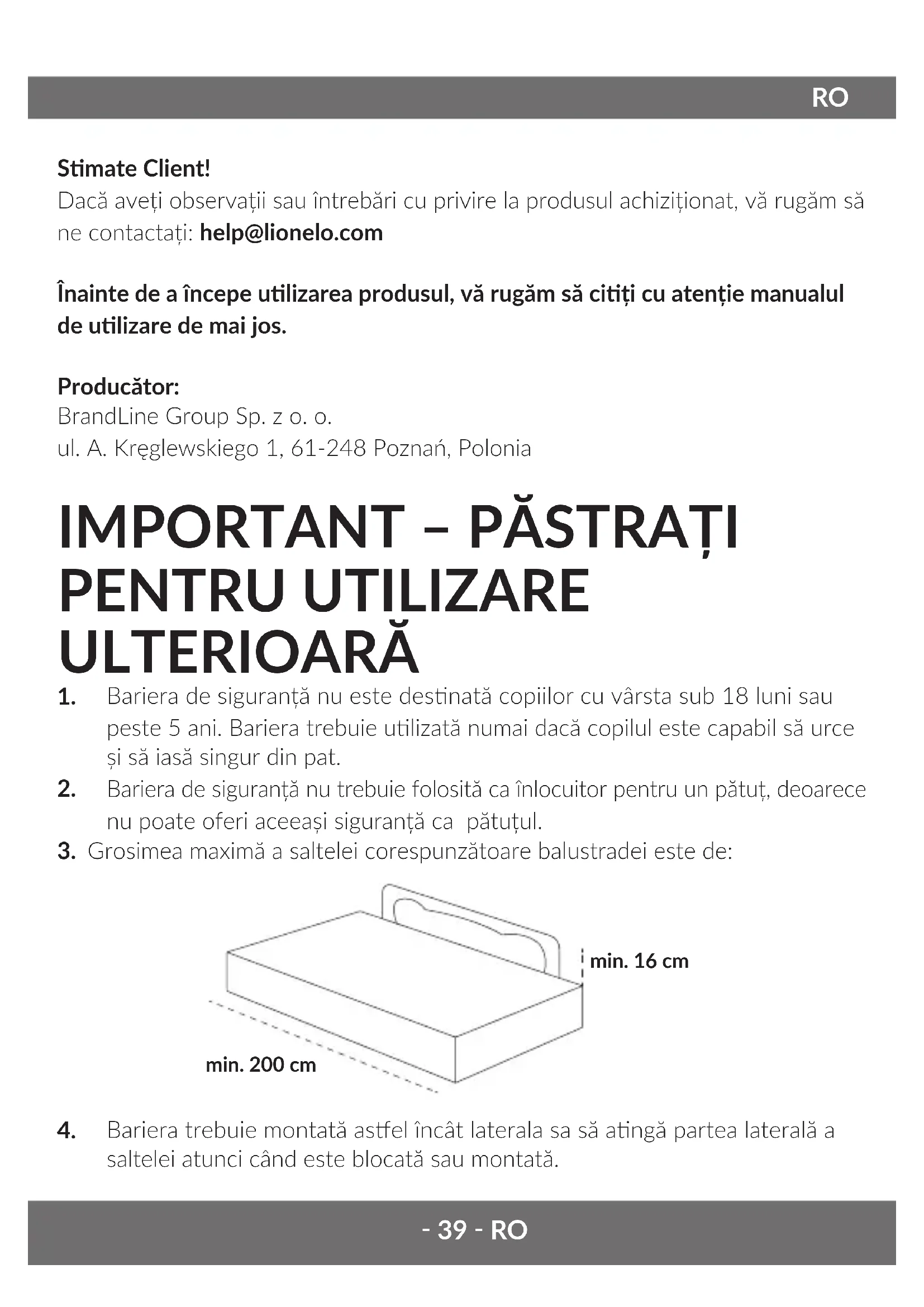 Bariera trebuie montată asel încât laterala sa să angă partea laterală a saltelei atunci când este blocată sau montată. RO‑ 40 ‑RO