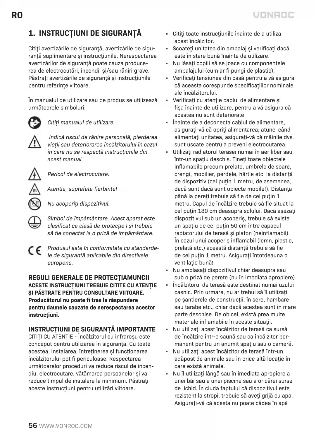 CITIȚI CU ATENȚIE - Încălzitorul cu infraroşu este conceput pentru utilizarea în siguranţă. Cu toate acestea, instalarea, întreţinerea şi funcţionarea încălzitorului pot fi periculoase. Respectarea următoarelor proceduri va reduce riscul de incen- diu, electrocutare, vătămarea persoanelor şi va reduce timpul de instalare la minimum. Păstraţi aceste instrucţiuni pentru utilizări viitoare.