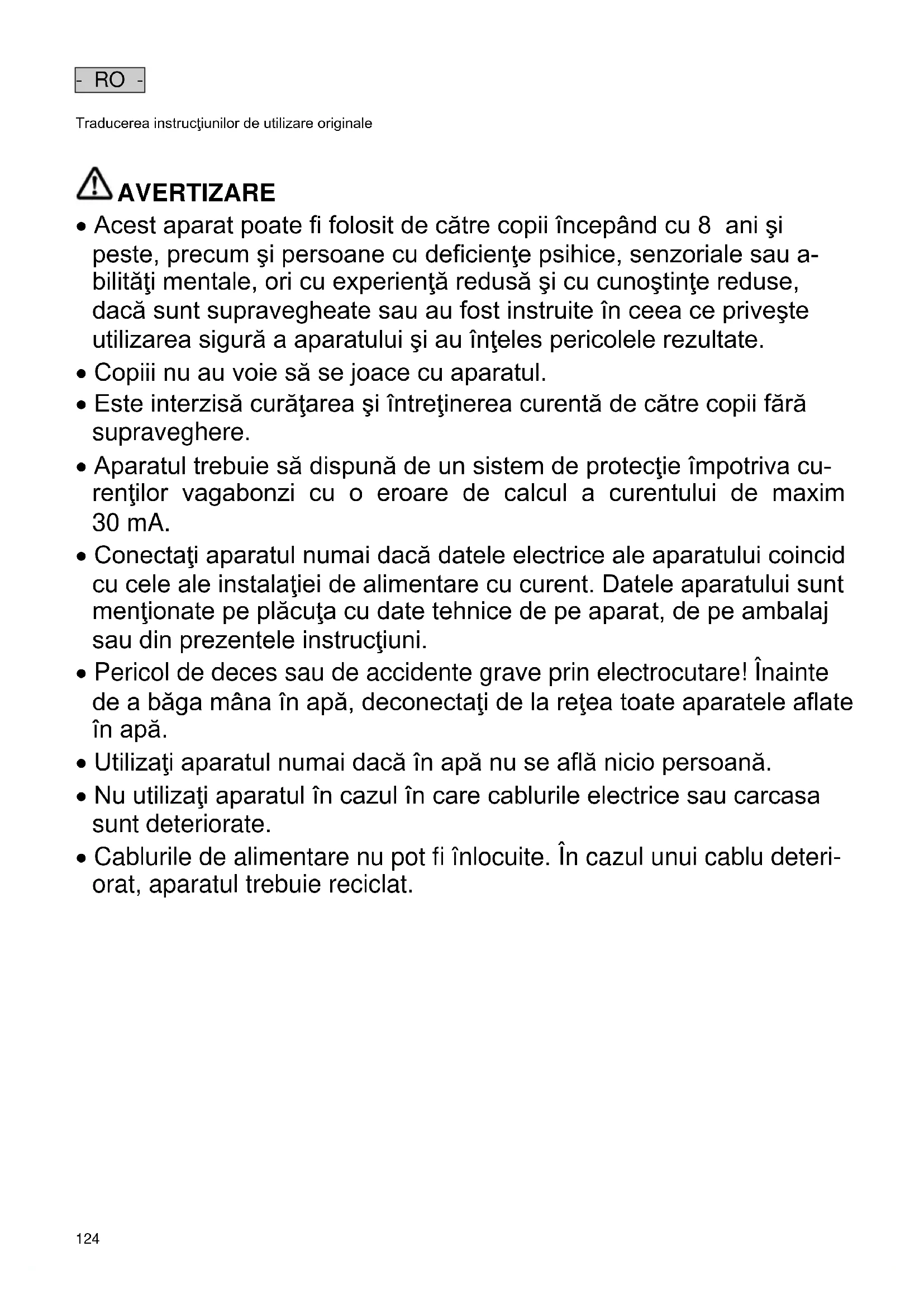 AVERTIZARE AVERTIZARE Acest aparat poate fi folosit de către copii începând cu 8 ani şi peste, precum şi persoane cu deficienţe psihice, senzoriale sau a- bilităţi mentale, ori cu experienţă redusă şi cu cunoştinţe reduse, dacă sunt supravegheate sau au fost instruite în ceea ce priveşte utilizarea sigură a aparatului şi au înţeles pericolele rezultate. Copiii nu au voie să se joace cu aparatul. Este interzisă curăţarea şi întreţinerea curentă de către copii fără supraveghere. Aparatul trebuie să dispună de un sistem de protecţie împotriva cu- renţilor vagabonzi cu o eroare de calcul a curentului de maxim 30 mA. Conectaţi aparatul numai dacă datele electrice ale aparatului coincid cu cele ale instalaţiei de alimentare cu curent. Datele aparatului sunt menţionate pe plăcuţa cu date tehnice de pe aparat, de pe ambalaj sau din prezentele instrucţiuni. Pericol de deces sau de accidente grave prin electrocutare! Înainte de a băga mâna în apă, deconectaţi de la reţea toate aparatele aflate în apă. Utilizaţi aparatul numai dacă în apă nu se află nicio persoană. Nu utilizaţi aparatul în cazul în care cablurile electrice sau carcasa sunt deteriorate. Cablurile de alimentare nu pot fi înlocuite. În cazul unui cablu deteri- orat, aparatul trebuie reciclat.- RO -