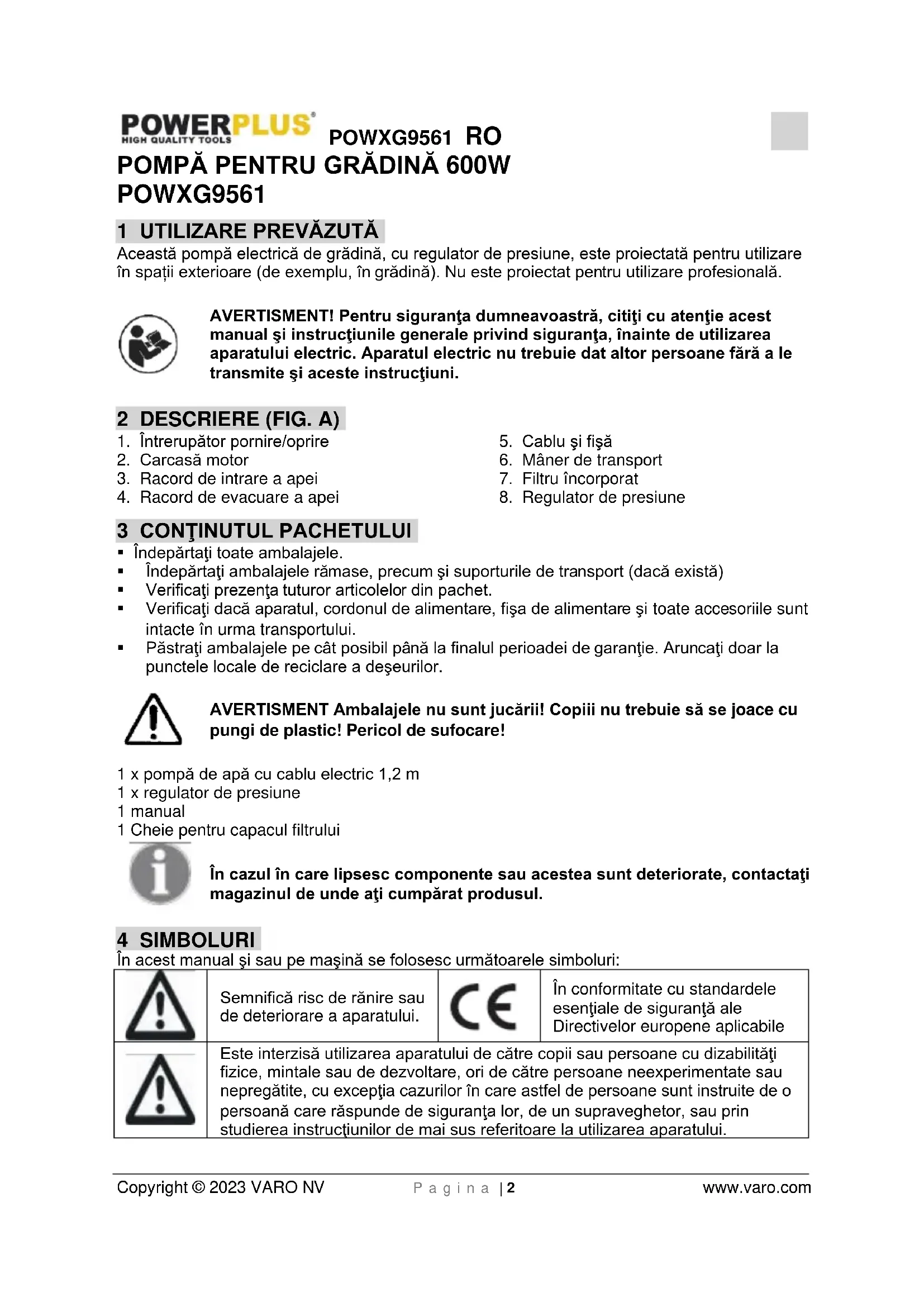 - În caz de probleme cu pompa, reparaţiile în garanţie trebuie efectuate de un centru de service autorizat. Nu folosiţi solvenţi precum petrol, alcool, apă amoniacală, etc. Aceşti solvenţi pot deteriora componentele de plastic. 9 DATE TEHNICE Tip POWXG9561 Tensiune / frecvenţă 230V~ /50Hz Puterea la intrare 600W Capacitate maximă de pompare 3000 l/oră Înălţime maximă de pompare 35 m Înălţime maximă de aspiraţie 7 m Temperatură maximă a apei 35°C Min. diametrul minim al furtunului de aspiraţie 1” (25 mm) Min. diametrul minim al furtunului de presiune 3/4” (20 mm) Lungimea cablului 1,2 m Presiune nominală 0,35 mPa –3,5 bar Clasă de protecţie la int. IPX4 Adecvat pentru Apă curată 10 ZGOMOT Valori ale emisiilor sonore măsurate în conformitate cu standardele aplicabile. (K=3) Nivel de presiune acustică LpA 68dB(A) Nivel de putere acustică LwA 81dB(A) ATENŢIE! Presiunea acustică poate depăşi 85 dB(A), caz în care trebuie purtat un dispozitiv de protecţie auditivă.POWXG9561 RO Copyright © 2023 VARO NV P a g i n a | 6 www.varo.com 11 DEPANAREA Problemă Cauză Soluţie Motorul electric funcţionează, dar pompa nu aspiră apă După pornirea pompei, corpul pompei nu se umple cu apă. Umpleţi pompa cu apă. Furtunul de aspiraţie nu este suficient de etanş. Verificaţi planurile şi componentele recomandate şi utilizate ale pompei, de ex. racordul duzei de aspiraţie, racordul furtunului de presiune, colier, furtun de aspiraţie etc., inclusiv banda de etanşare din teflon sau cânepa pentru filet. . Pompa funcţionează numai dacă este etanşată corespunzător. Sita de filtrare a supapei anti-retur a racordului de intrare este înfundată. Curăţaţi supapa anti-retur a racordului de intrare şi sita de filtrare. Aerul nu iese din furtunul de presiune, deoarece racordul de ieşire a apei este închis. Când pompa începe să aspire, deschideţi racordul de ieşire a apei (de ex. robinetul, aspersorul etc.). Timpul de amorsare nu este conform reglementărilor. Umpleţi furtunul de aspiraţie cu apă sau verificaţi din nou după cel puţin 7 minute de la pornirea pompei. Înălţime de aspiraţie prea mare (> 8 m). Reduceţi înălţimea de aspiraţie. Supapa anti-retur nu aspiră apă. Verificaţi nivelul apei în puţ sau în bazinul de apă. Dacă este posibil, prelungiţi furtunul de aspiraţie. Electromotorul nu funcţionează. Nu este alimentat cu energie. Verificaţi alimentarea cu energie. Capacul elicei blochează rotorul. Deconectaţi fişa de alimentare, scoateţi capacul rotorului cu ajutorul unei şurubelniţe, apoi montaţi-l la loc rotind uşor rotorul şi verificaţi dacă se roteşte liber. Elicea este blocată. Deconectaţi fişa de alimentare, deplasaţi axul cu ajutorul unei şurubelniţe în butucul elicei. Dacă axul este blocat, trimiteţi pompa la un centru de service pentru verificări. Debitul de apă pompat este insuficient. Înălţime de aspiraţie prea mare (> 8 m). Verificaţi înălţimea de aspiraţie. Sita de filtrare a supapei anti-retur este înfundată. Curăţaţi sita de filtrare. Nivelul apei aspirate a scăzut prea mult. Introduceţi mai adânc în apă supapa anti-retur.POWXG9561 RO Copyright © 2023 VARO NV P a g i n a | 7 www.varo.com Problemă Cauză Soluţie Impurităţile au redus capacitatea reală a pompei. Spălaţi cu apă sub presiune corpul pompei, furtunul de aspiraţie şi furtunul de presiune pentru evacuare. Întrerupătorul de protecţie la supraîncălzire nu opreşte pompa. Supraîncărcarea motorului electric din cauza frecării provocate de impurităţile care pătrund în motor. Spălaţi corpul pompei cu apă sub presiune. Întrerupătorul pompei este în permanenţă în poziţia OPRIT sau PORNIT. Supapa anti-retur nu este montată pe furtunul de aspiraţie. Verificaţi montarea supapei pe furtunul de aspiraţie. Întrerupătorul comută prea frecvent între poziţiile PORNIT / OPRIT (la utilizarea pentru alimentarea cu apă a locuinţelor). Învelişul din cauciuc din rezervorul de presiune este rupt. Înlocuiţi învelişul din cauciuc sau rezervorul. Lipsa aerului comprimat din rezervor. Utilizaţi o supapă corespunzătoare şi racordaţi la o sursă de aer comprimat de 1,8 bar; alimentaţi rezervorul cu aer comprimat. 12 GARANŢIE