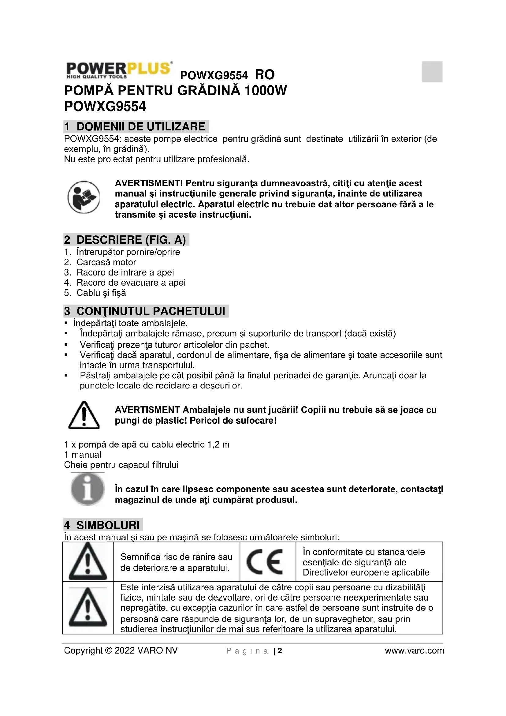 Este interzisă utilizarea aparatului de către copii sau persoane cu dizabilităţi fizice, mintale sau de dezvoltare, ori de către persoane neexperimentate sau nepregătite, cu excepţia cazurilor în care astfel de persoane sunt instruite de o persoană care răspunde de siguranţa lor, de un supraveghetor, sau prin studierea instrucţiunilor de mai sus referitoare la utilizarea aparatului.POWXG9554 RO Copyright © 2022 VARO NV P a g i n a | 3 www.varo.com