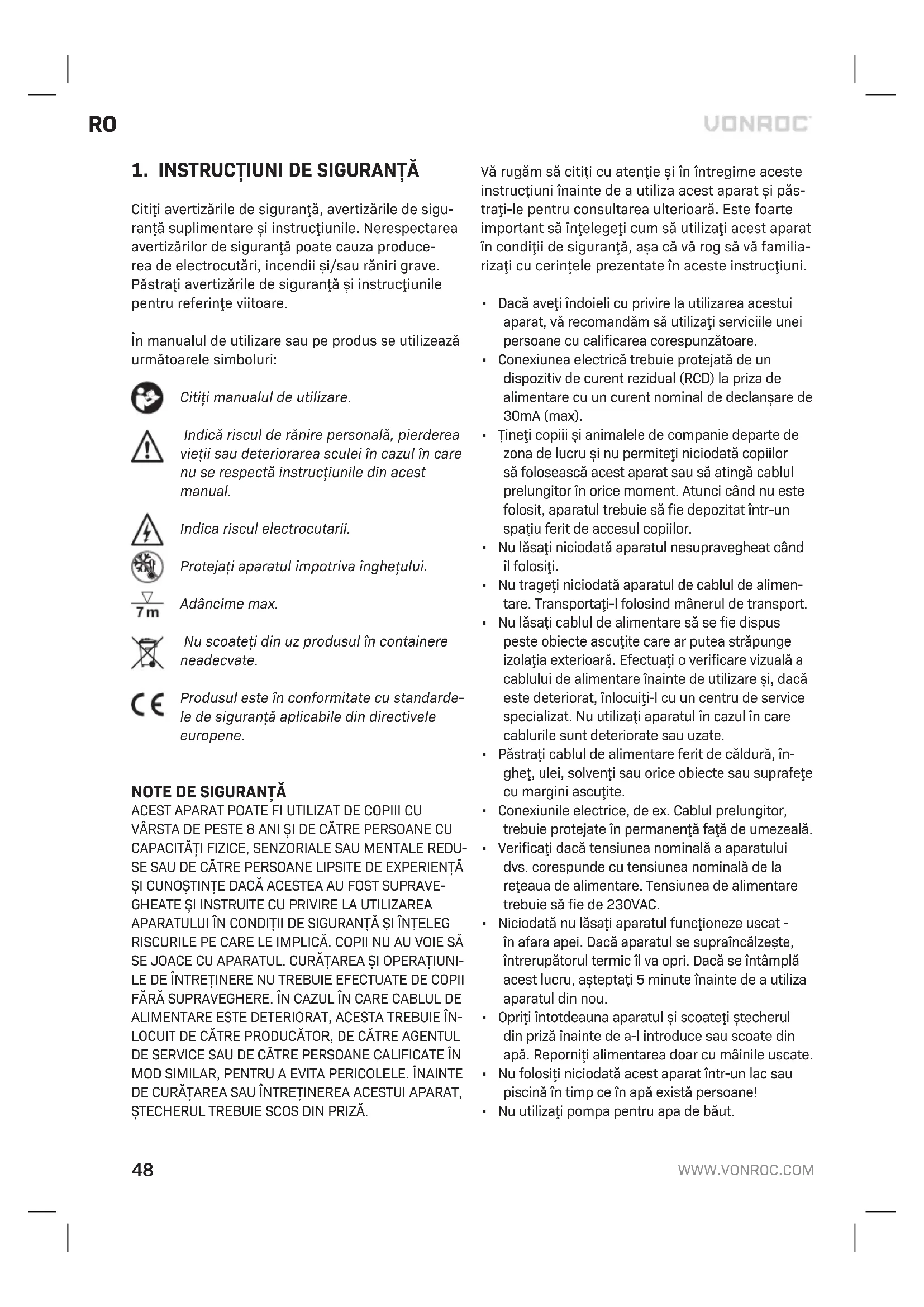 CAJELE”) Asigurai-vă că temperatura apei nu a depăşit maximum 35°C MEDIU Aparatele electrice sau electronice deteriorate şi/sau defecte trebuie colectate în locurile de reciclare corespunzătoare. Numai pentru ţările din CE Nu aruncai echipamentele acionate electric îm- preună cu gunoiul menajer. Conform Indicaiei eu- ropene 2012/19/EU pentru echipamente electrice și electronice uzate și a implementării sale la nivel naional, echipamentele acionate electric scoase din uz trebuie colectate separat și evacuate într-o manieră ecologică. GARANŢIE Produsele VONROC sunt realizate la cele mai înalte standarde de calitate și sunt garantate în privin- a materialelor și a manoperei pentru întreaga perioadă de utilizare în garanie, începând cu data achiziiei. În cazul în care produsul se defectează în timpul perioadei de utilizare, contactai direct VONROC. Următoarele circumstane sunt excluse de la această garanie:
