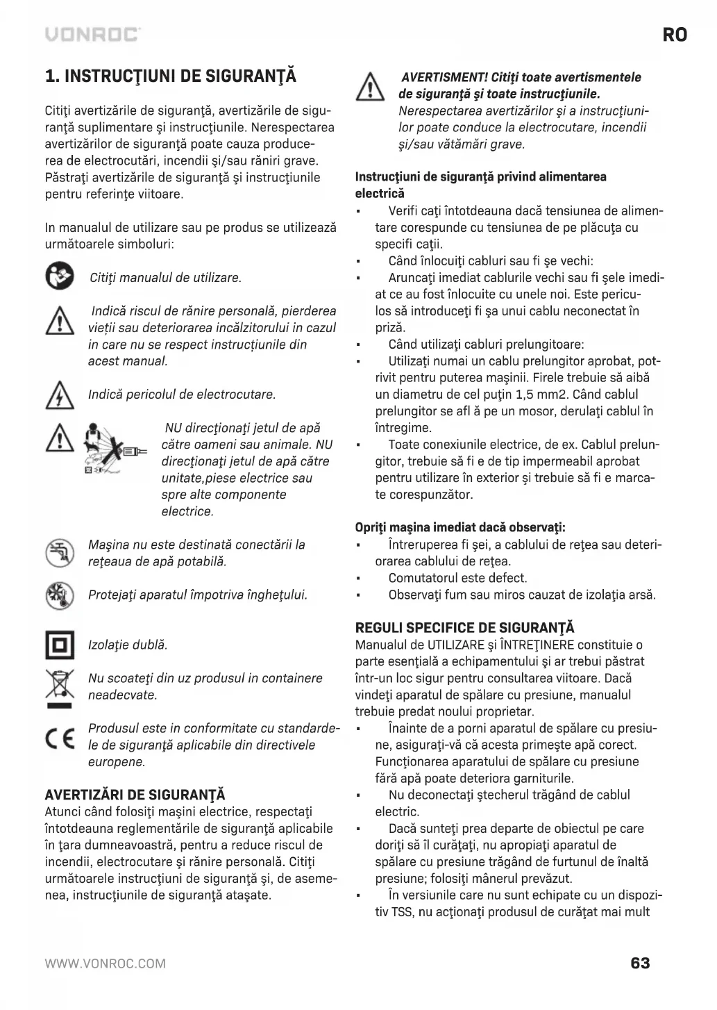 Citiţi avertizările de siguranţă, avertizările de sigu- ranţă suplimentare şi instrucţiunile. Nerespectarea avertizărilor de siguranţă poate cauza produce- rea de electrocutări, incendii şi/sau răniri grave. Păstraţi avertizările de siguranţă şi instrucţiunile pentru referinţe viitoare. In manualul de utilizare sau pe produs se utilizează următoarele simboluri: Citiţi manualul de utilizare. Indică riscul de rănire personală, pierderea vieții sau deteriorarea incălzitorului in cazul in care nu se respect instrucțiunile din acest manual. Indică pericolul de electrocutare. NU direcţionaţi jetul de apă către oameni sau animale. NU direcţionaţi jetul de apă către unitate,piese electrice sau spre alte componente electrice. Maşina nu este destinată conectării la reţeaua de apă potabilă. Protejaţi aparatul împotriva îngheţului. Izolaţie dublă. Nu scoateţi din uz produsul in containere neadecvate. Produsul este in conformitate cu standarde- le de siguranţă aplicabile din directivele europene.