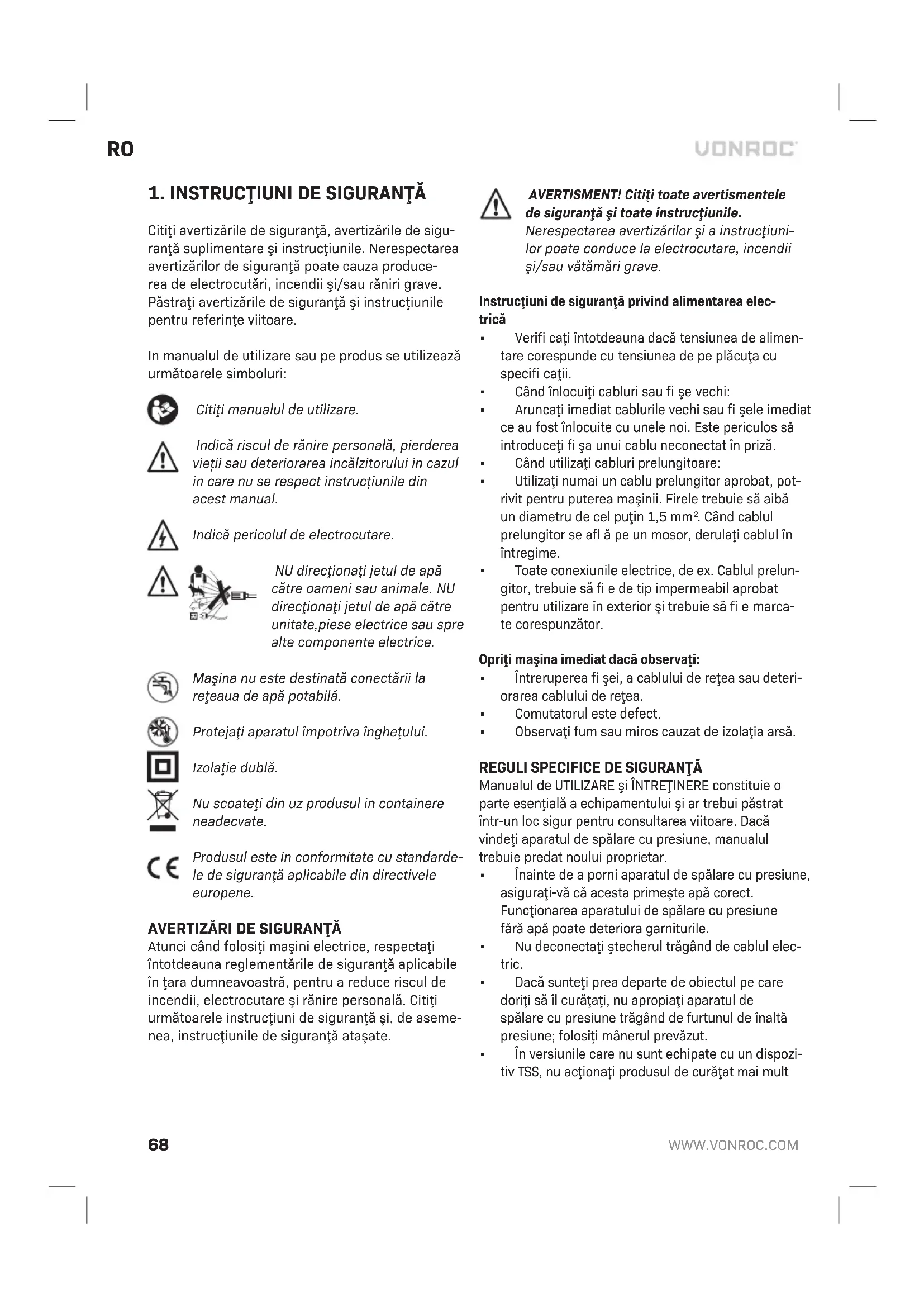 Citiţi avertizările de siguranţă, avertizările de sigu- ranţă suplimentare şi instrucţiunile. Nerespectarea avertizărilor de siguranţă poate cauza produce- rea de electrocutări, incendii şi/sau răniri grave. Păstraţi avertizările de siguranţă şi instrucţiunile pentru referinţe viitoare. In manualul de utilizare sau pe produs se utilizează următoarele simboluri: Citiţi manualul de utilizare. Indică riscul de rănire personală, pierderea vieții sau deteriorarea incălzitorului in cazul in care nu se respect instrucțiunile din acest manual. Indică pericolul de electrocutare. NU direcţionaţi jetul de apă către oameni sau animale. NU direcţionaţi jetul de apă către unitate,piese electrice sau spre alte componente electrice. Maşina nu este destinată conectării la reţeaua de apă potabilă. Protejaţi aparatul împotriva îngheţului. Izolaţie dublă. Nu scoateţi din uz produsul in containere neadecvate. Produsul este in conformitate cu standarde- le de siguranţă aplicabile din directivele europene.