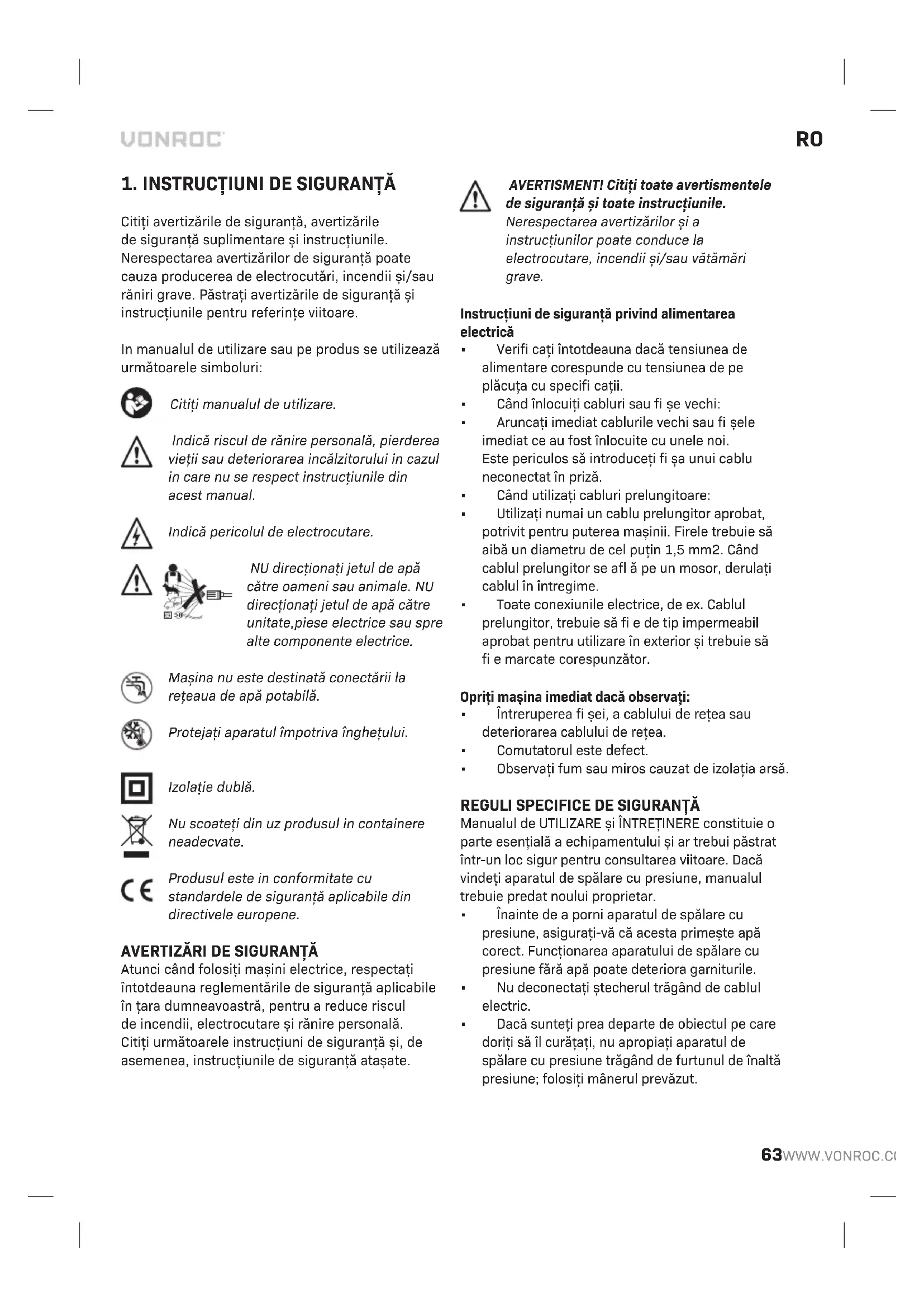 Citiți avertizările de siguranță, avertizările de siguranță suplimentare și instrucțiunile. Nerespectarea avertizărilor de siguranță poate cauza producerea de electrocutări, incendii și/sau răniri grave. Păstrați avertizările de siguranță și instrucțiunile pentru referințe viitoare. In manualul de utilizare sau pe produs se utilizează următoarele simboluri: Citiți manualul de utilizare. Indică riscul de rănire personală, pierderea vieții sau deteriorarea incălzitorului in cazul in care nu se respect instrucțiunile din acest manual. Indică pericolul de electrocutare. NU direcționați jetul de apă către oameni sau animale. NU direcționați jetul de apă către unitate,piese electrice sau spre alte componente electrice. Mașina nu este destinată conectării la rețeaua de apă potabilă. Protejați aparatul împotriva înghețului. Izolație dublă. Nu scoateți din uz produsul in containere neadecvate. Produsul este in conformitate cu standardele de siguranță aplicabile din directivele europene.