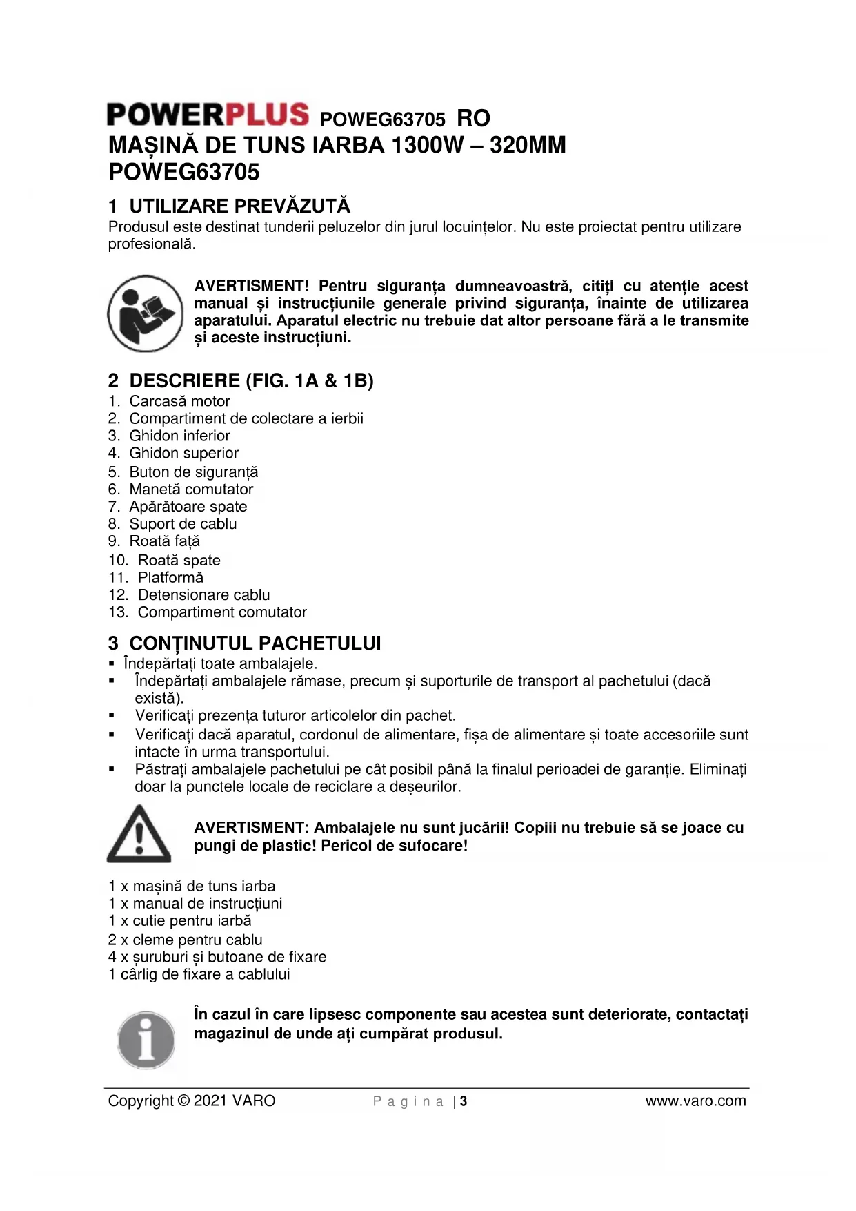 AVERTISMENT!Nu porniți mașina decât după asamblarea completă. Înainte de a porni mașina, verificați întotdeauna cablul de conectare să nu fie deteriorat; trebuie utilizate numai cabluri de conectare nedeteriorate. Notă: Cablurile de conectare deteriorate sunt extrem de periculoase! Dacă încercați să porniți mașina de tuns iarba în iarbă înaltă, motorul s-ar putea supraîncălzi și ar putea fi avariat.POWEG63705 RO Copyright © 2021 VARO P a g i n a | 10 www.varo.com