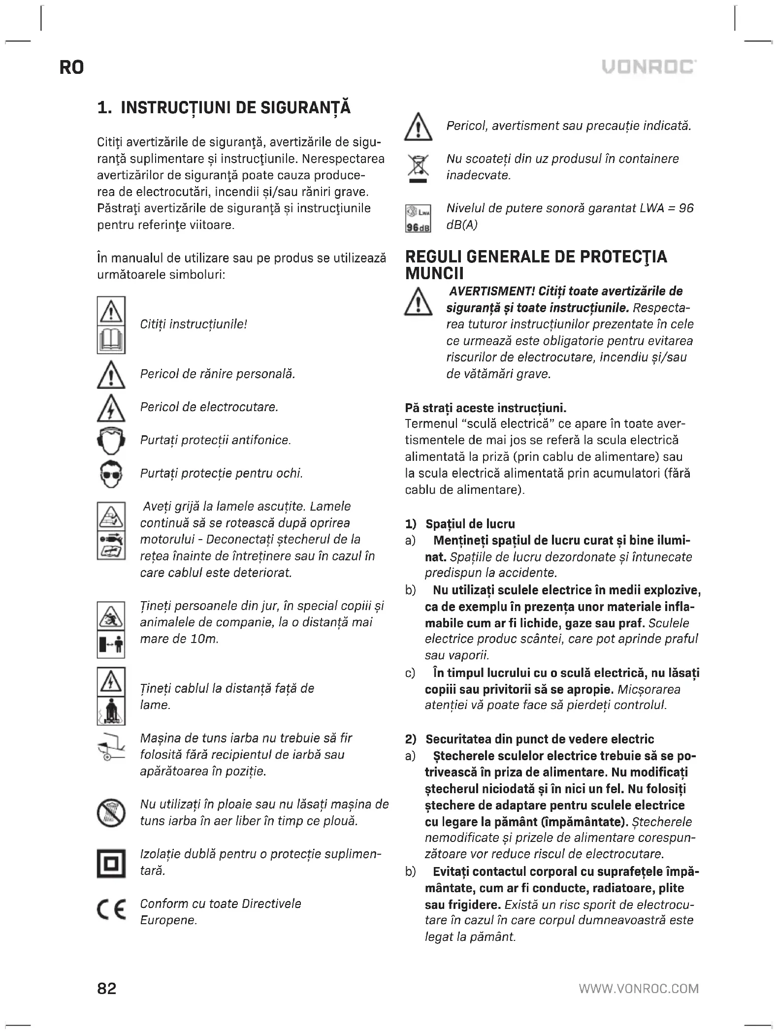 - Pentru a curăţa maşina de tuns iarba, folo- siţi doar săpun delicat şi o cârpă umedă. Nu permiteţi niciodată pătrunderea vreunui lichid în maşină şi nu scufundaţi niciodată vreo parte a maşinii în lichid. Nu utilizaţi nicio soluţie de curăţare abrazivă sau pe bază de solvenţi. MEDIU Aparatele electrice sau electronice deteriorate şi/sau defecte trebuie colectate în locurile de reciclare corespunzătoare. Numai pentru ţările din CE Nu aruncaţi echipamentele acţionate electric îm- preună cu gunoiul menajer. Conform Indicaţiei eu- ropene 2012/19/EU pentru echipamente electrice şi electronice uzate şi a implementării sale la nivel naţional, echipamentele acţionate electric scoase din uz trebuie colectate separat şi evacuate într-o manieră ecologică. GARANŢIE Produsele VONROC sunt realizate la cele mai înalte standarde de calitate şi sunt garantate în privin- ţa materialelor şi a manoperei pentru întreaga perioadă de utilizare în garanţie, începând cu data achiziţiei. În cazul în care produsul se defectează în timpul perioadei de utilizare, contactaţi direct VONROC.90
