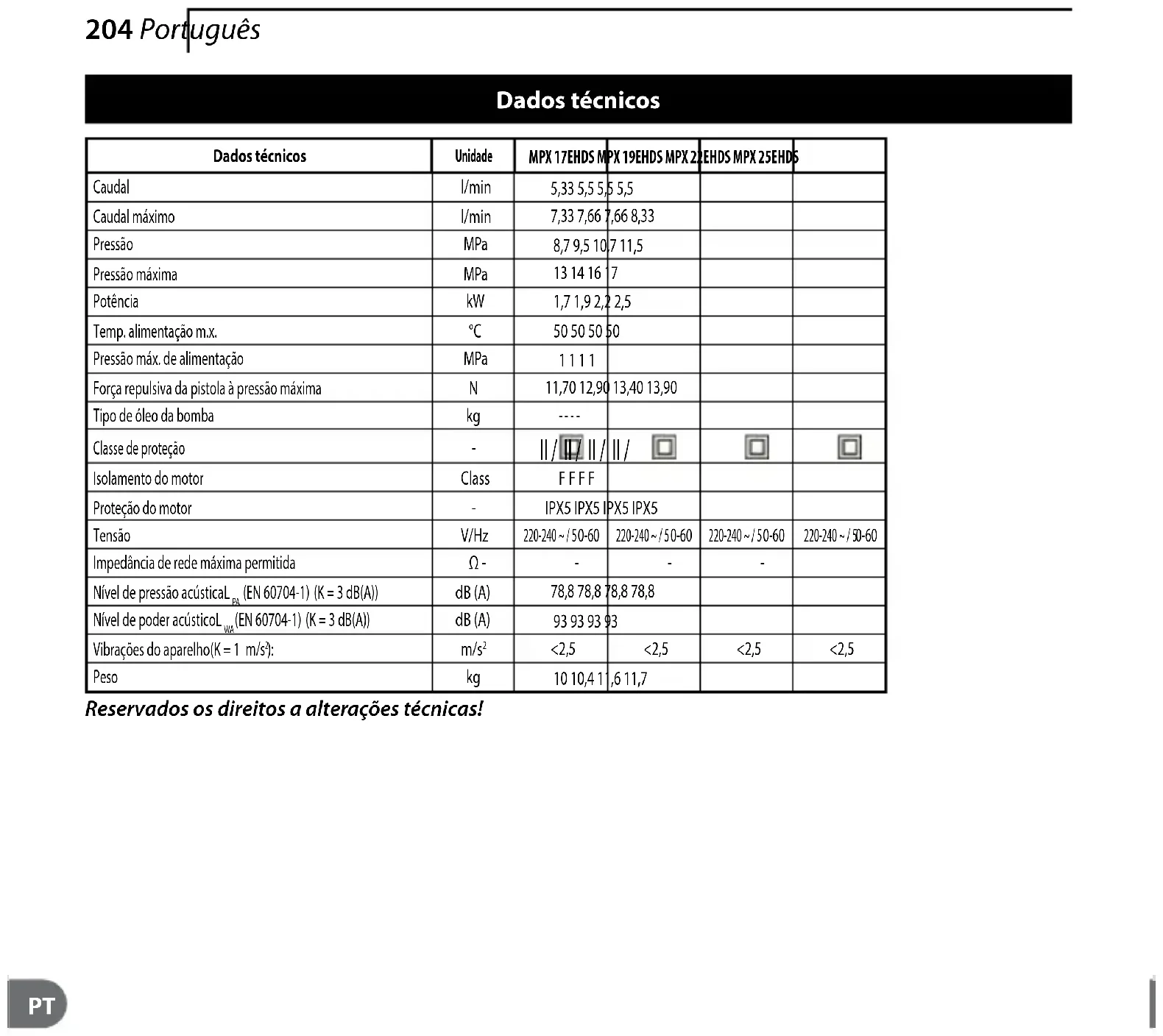 Presiunea maximă la admisie MPa 1 1 1 1Forţa de respingere a pistolului la presiunea maximă 11,70 12,90 13,40 13,90Tip de ulei pentru pompă - - - -Clasa de protecție
