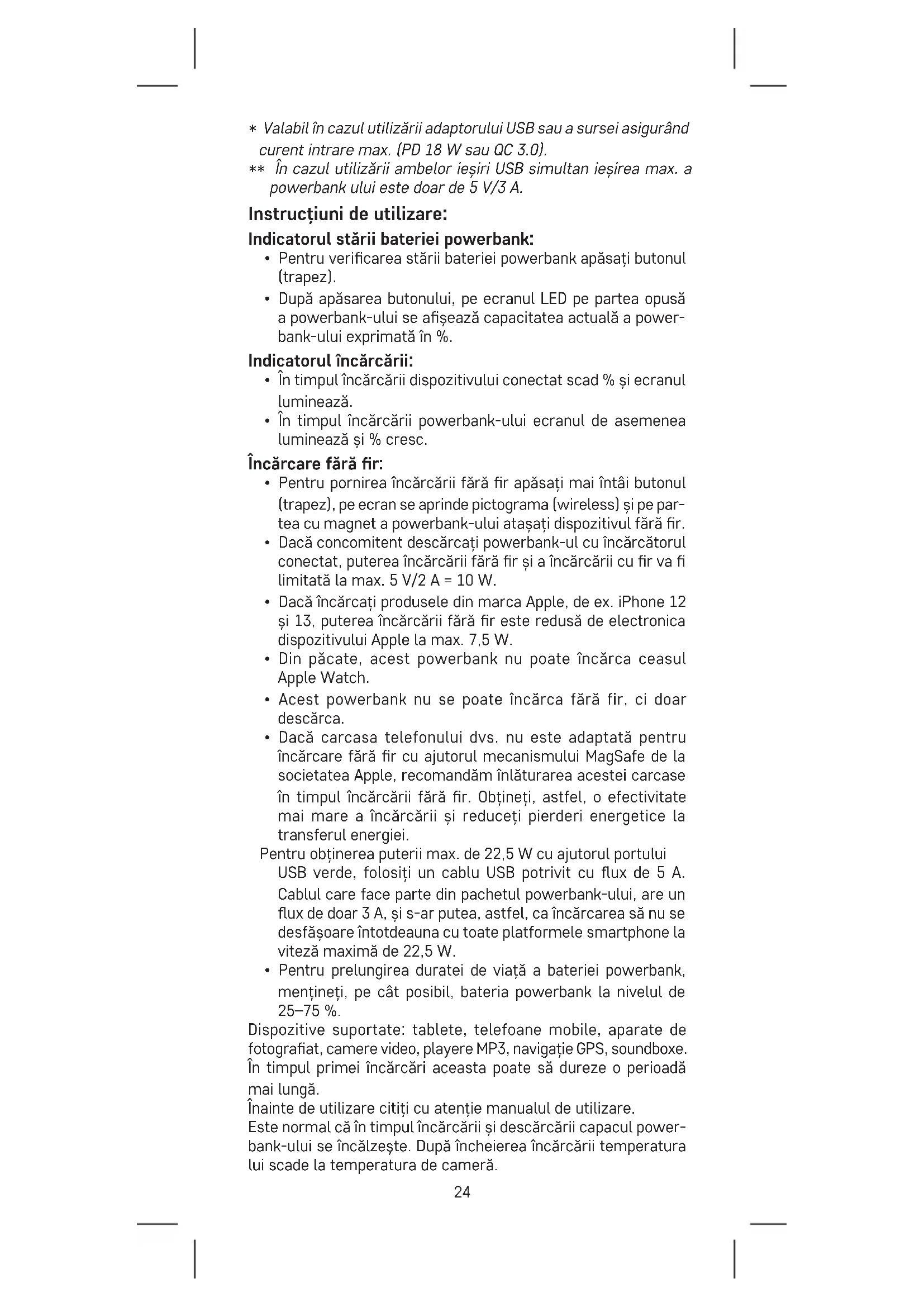 - Dacă carcasa telefonului dvs. nu este adaptată pentru încărcare fără r cu ajutorul mecanismului MagSafe de la societatea Apple, recomandăm înlăturarea acestei carcase în timpul încărcării fără r. Obțineți, astfel, o efectivitate mai mare a încărcării și reduceți pierderi energetice la transferul energiei. Pentru obținerea puterii max. de 22,5 W cu ajutorul portului USB verde, folosiți un cablu USB potrivit cu ux de 5 A. Cablul care face parte din pachetul powerbank-ului, are un ux de doar 3 A, și s-ar putea, astfel, ca încărcarea să nu se desfășoare întotdeauna cu toate platformele smartphone la viteză maximă de 22,5 W.
