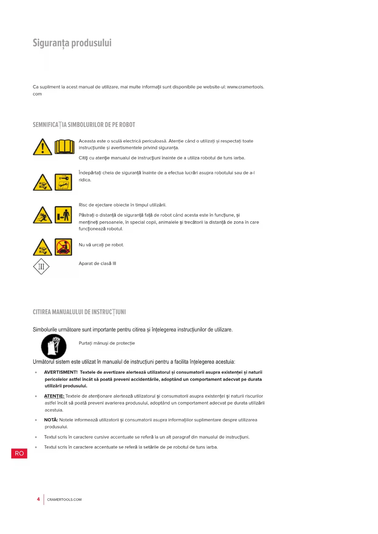 Aceasta este o sculă electrică periculoasă. Atenție când o utilizați și respectați toate instrucțiunile și avertismentele privind siguranța. Citiţi cu atenţie manualul de instrucţiuni înainte de a utiliza robotul de tuns iarba. Îndepărtați cheia de siguranță înainte de a efectua lucrări asupra robotului sau de a-l ridica. Risc de ejectare obiecte în timpul utilizării. Păstrați o distanță de siguranță față de robot când acesta este în funcțiune, și mențineți persoanele, în special copii, animalele și trecătorii la distanță de zona în care funcționează robotul. Nu vă urcați pe robot. Aparat de clasă III Ca supliment la acest manual de utilizare, mai multe informații sunt disponibile pe website-ul: www.cramertools. com