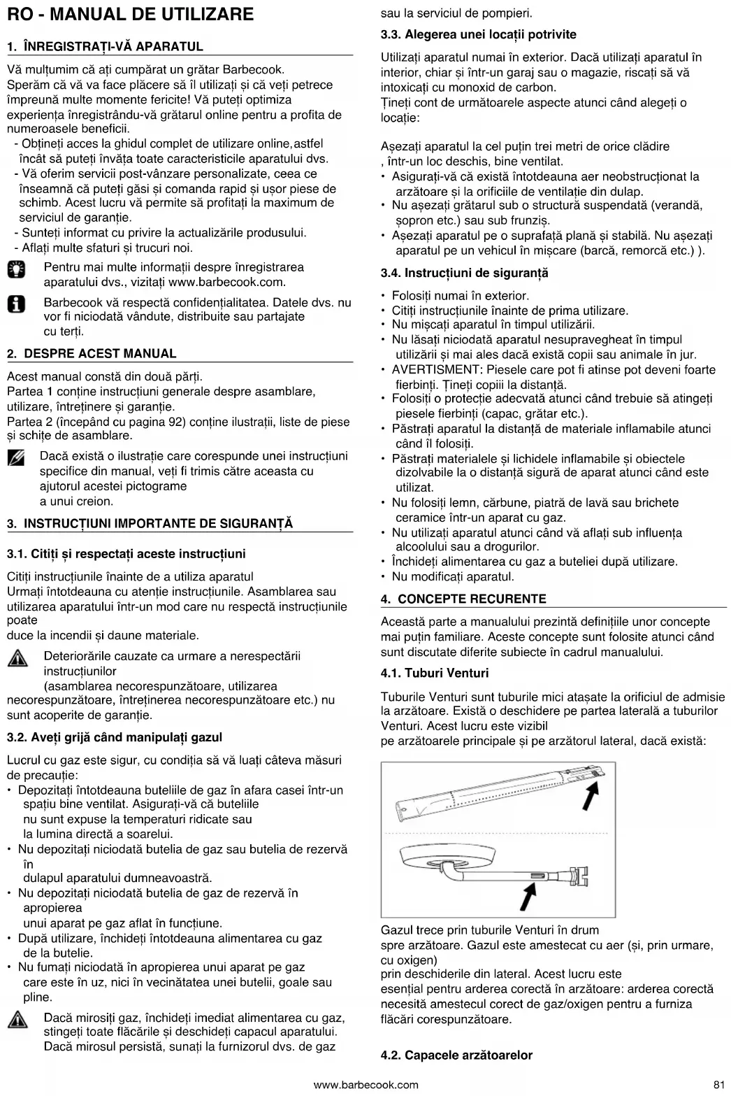 3.1. Citiți și respectați aceste instrucțiuni Citiți instrucțiunile înainte de a utiliza aparatul Urmați întotdeauna cu atenție instrucțiunile. Asamblarea sau utilizarea aparatului într-un mod care nu respectă instrucțiunile poate duce la incendii și daune materiale. Deteriorările cauzate ca urmare a nerespectării instrucțiunilor (asamblarea necorespunzătoare, utilizarea necorespunzătoare, întreținerea necorespunzătoare etc.) nu sunt acoperite de garanție. 3.2. Aveți grijă când manipulați gazul Lucrul cu gaz este sigur, cu condiția să vă luați câteva măsuri de precauție: