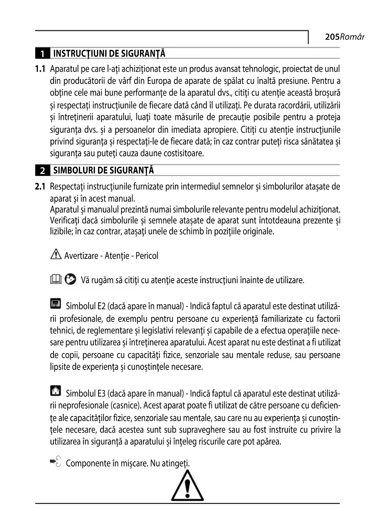 aparat şi în acest manual. Aparatul şi manualul prezintă numai simbolurile relevante pentru modelul achiziţionat. Verificaţi dacă simbolurile şi semnele ataşate de aparat sunt întotdeauna prezente şi lizibile; în caz contrar, ataşaţi unele de schimb în poziţiile originale. Avertizare - Atenţie - Pericol Vă rugăm să citiţi cu atenţie aceste instrucţiuni înainte de utilizare. Simbolul E2 (dacă apare în manual) - Indică faptul că aparatul este destinat utiliză- rii profesionale, de exemplu pentru persoane cu experienţă familiarizate cu factorii tehnici, de reglementare şi legislativi relevanţi şi capabile de a efectua operaţiile nece- sare pentru utilizarea şi întreţinerea aparatului. Acest aparat nu este destinat a fi utilizat de copii, persoane cu capacităţi fizice, senzoriale sau mentale reduse, sau persoane lipsite de experienţa şi cunoştinţele necesare. Simbolul E3 (dacă apare în manual) - Indică faptul că aparatul este destinat utiliză- rii neprofesionale (casnice). Acest aparat poate fi utilizat de către persoane cu deficien- ţe ale capacităţilor fizice, senzoriale sau mentale, sau care nu au experienţa şi cunoştin- ţele necesare, dacă acestea sunt sub supraveghere sau au fost instruite cu privire la utilizarea în siguranţă a aparatului şi înţeleg riscurile care pot apărea. Componente în mişcare. Nu atingeţi.206 Română 0 Poziţia „oprit”