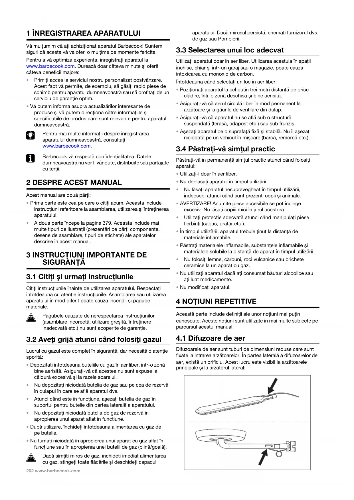 Diametru injectoare ...................................................212 14 Depanare..........................................................................213 MAN_GAS_QUISSON_BBC_140730_A.book Page 201 Tuesday, February 2, 2016 4:55 PM202 www.barbecook.com 1 ÎNREGISTRAREA APARATULUI Vă mulţumim că aţi achiziţionat aparatul Barbecook! Suntem siguri că acesta vă va oferi o mulţime de momente fericite. Pentru a vă optimiza experienţa, înregistraţi aparatul la www.barbecook.com. Durează doar câteva minute şi oferă câteva beneficii majore: